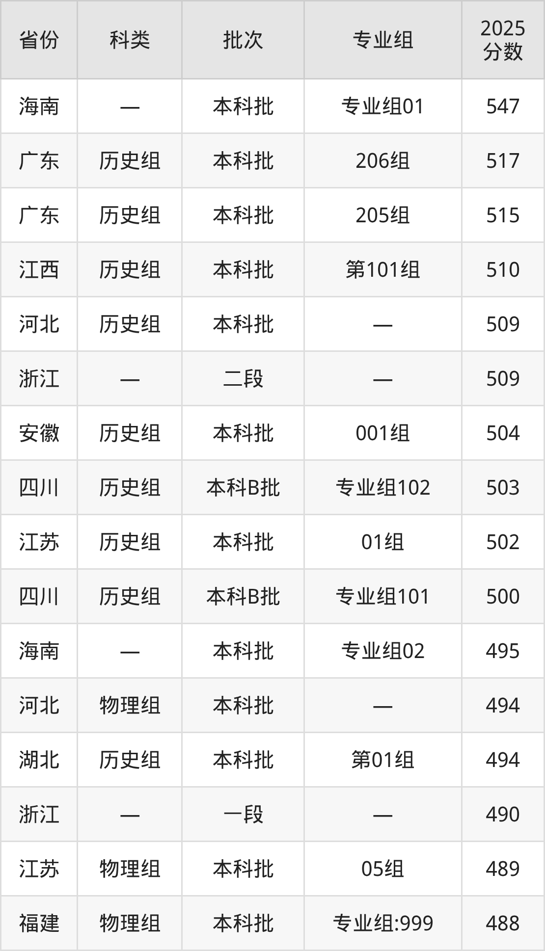 而海南地区考生的分数门槛最高,2025年湖北大学知行学院专业组01在海南招生最低分为547分,考生至少要超本科线67分才有可能被录取。