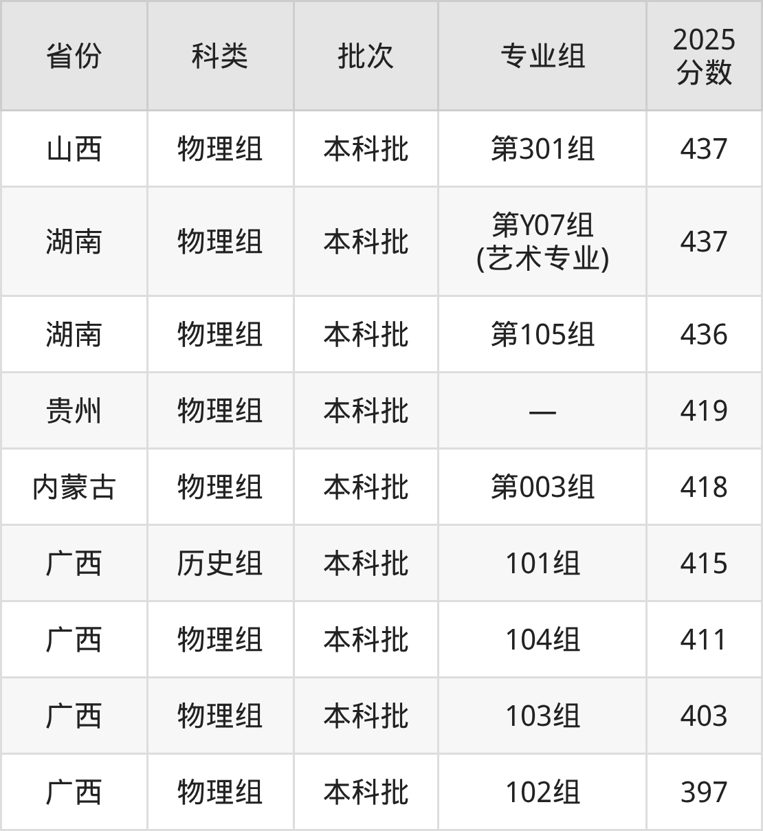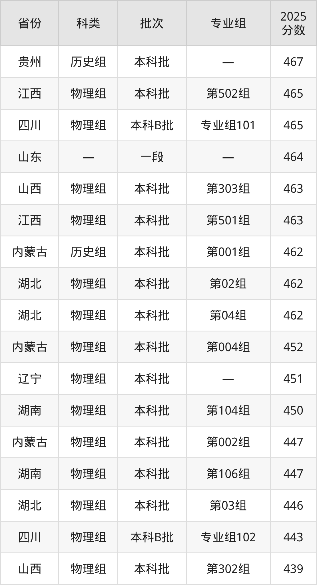 2025年湖北大学知行学院在全国普通批次招生的录取分数范围位于397~547分之间,其中省内分数范围为446分~494分,历史组最低分专业组为“第01组”,考生494分即可报考,物理组最低分专业组为“第03组”,考生446分即可报考。