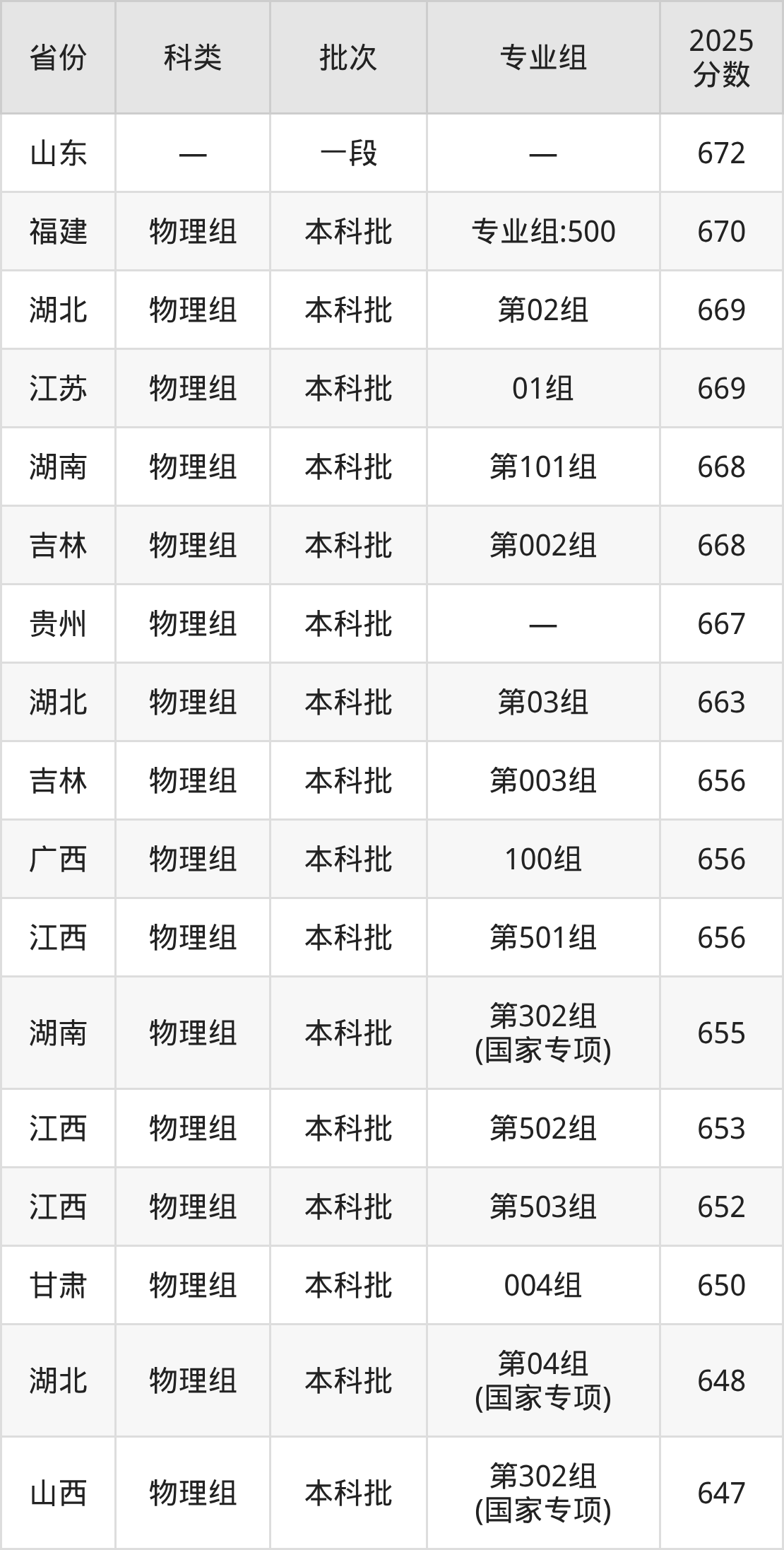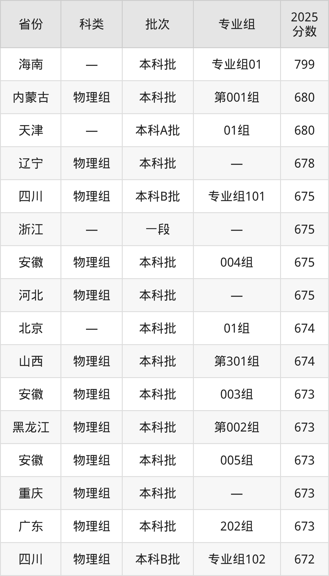 2025年中国科学技术大学在全国普通批次招生的录取分数范围位于580~799分之间,其中省内分数范围为673分~675分,物理组最低分专业组为“003组”,考生673分即可报考。