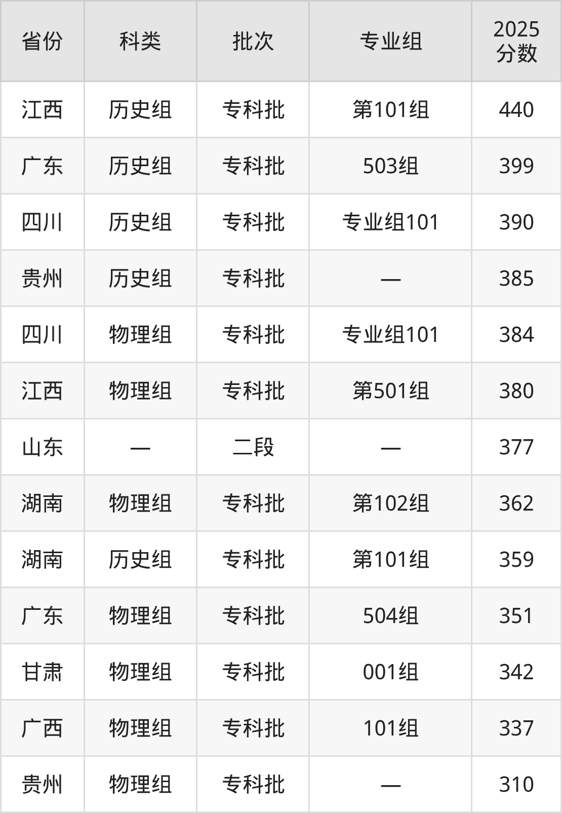 而江西地区历史组考生的分数门槛最高,2025年湖南有色金属职业技术学院第101组在江西招生最低分为440分,考生至少要超专科线150分才有可能被录取。