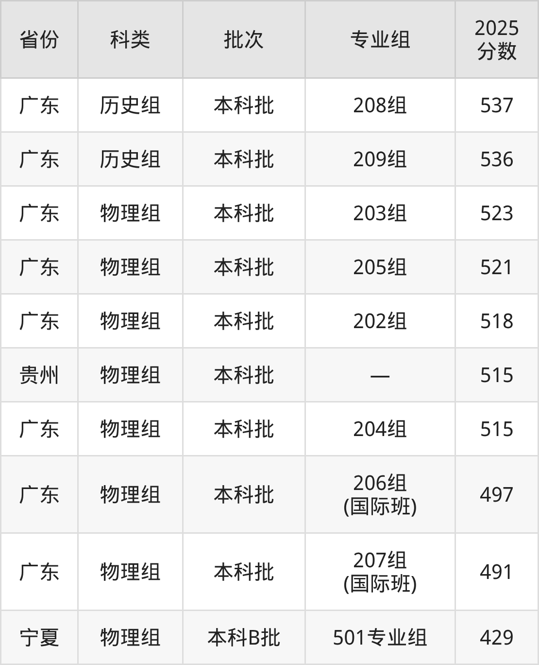 2025年仲恺农业工程学院在全国普通批次招生的录取分数范围位于429~537分之间,其中省内分数范围为491分~537分,历史组最低分专业组为“209组”,考生536分即可报考,物理组最低分专业组为“207组(国际班)”,考生491分即可报考。