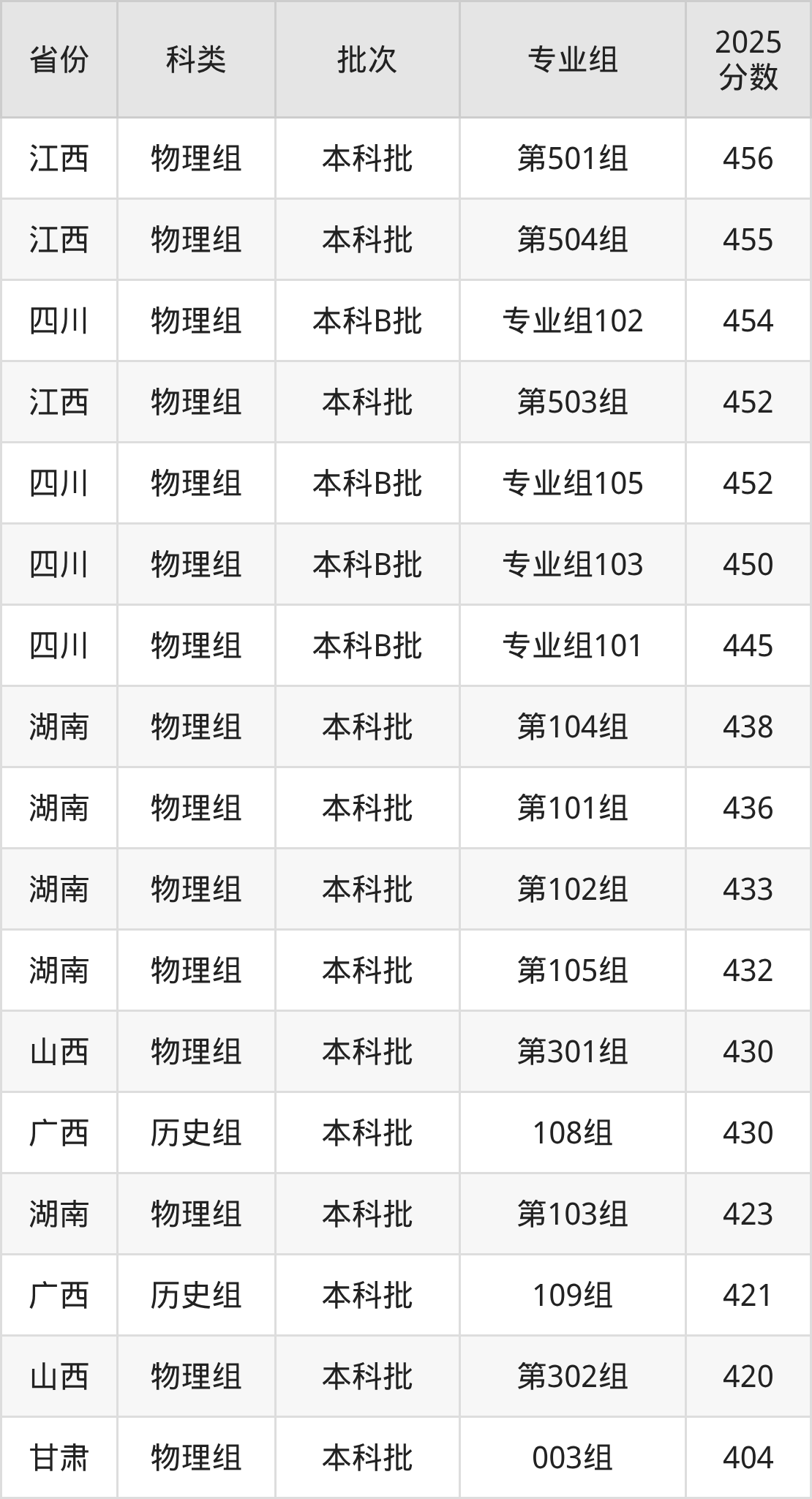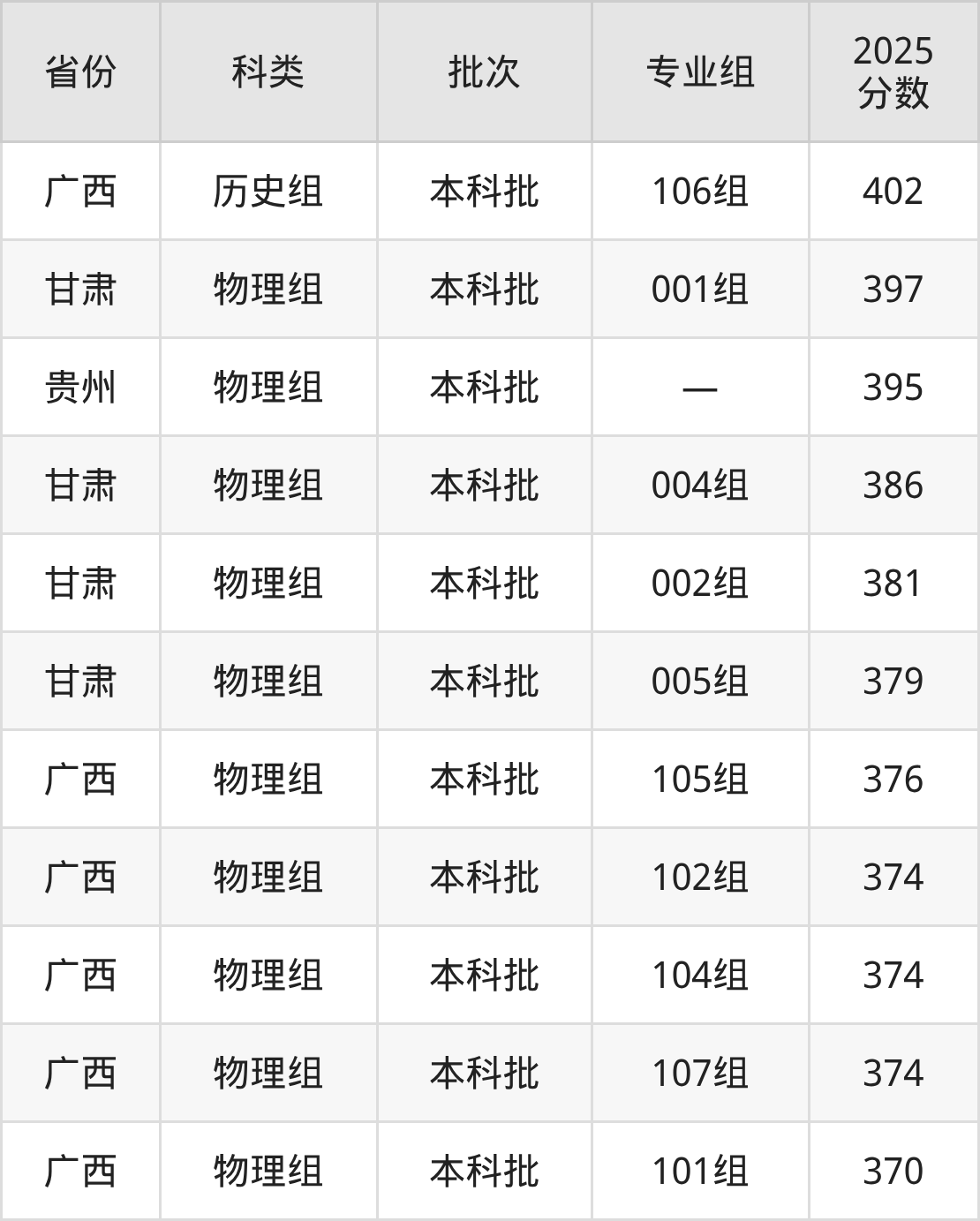 浙江农林大学暨阳学院在省外招生的最低分为370分,其中广西地区物理组考生上浙江农林大学暨阳学院的分数门槛最低,考生成绩达本科线即可报考。其次是甘肃物理组考生,上浙江农林大学暨阳学院至少要超本科线5分(379分)。