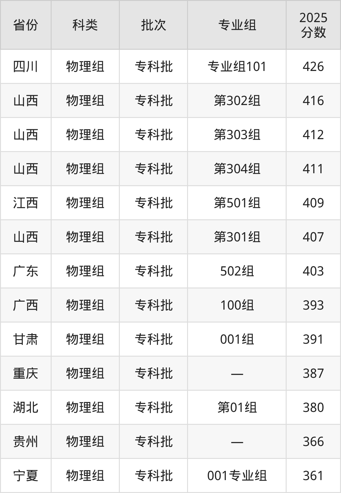 而四川地区物理组考生的分数门槛最高,2025年昆明铁道职业技术学院专业组101在四川招生最低分为426分,考生至少要超专科线276分才有可能被录取。
