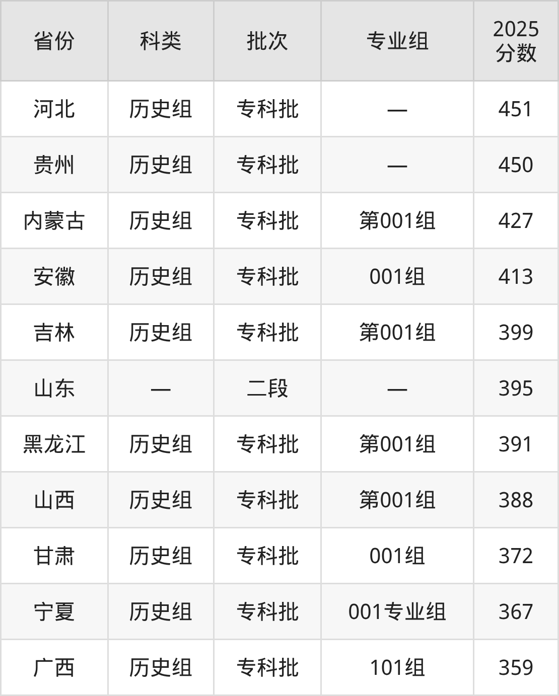 而河北地区历史组考生的分数门槛最高,2025年山东司法警官职业学院在河北招生最低分为451分,考生至少要超专科线251分才有可能被录取。