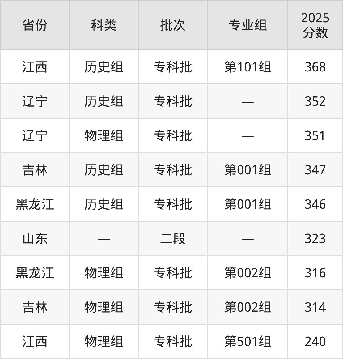 2025年吉林通用航空职业技术学院在全国普通批次招生的录取分数范围位于240~368分之间,其中省内分数范围为314分~347分,历史组最低分专业组为“第001组”,考生347分即可报考,物理组最低分专业组为“第002组”,考生314分即可报考。