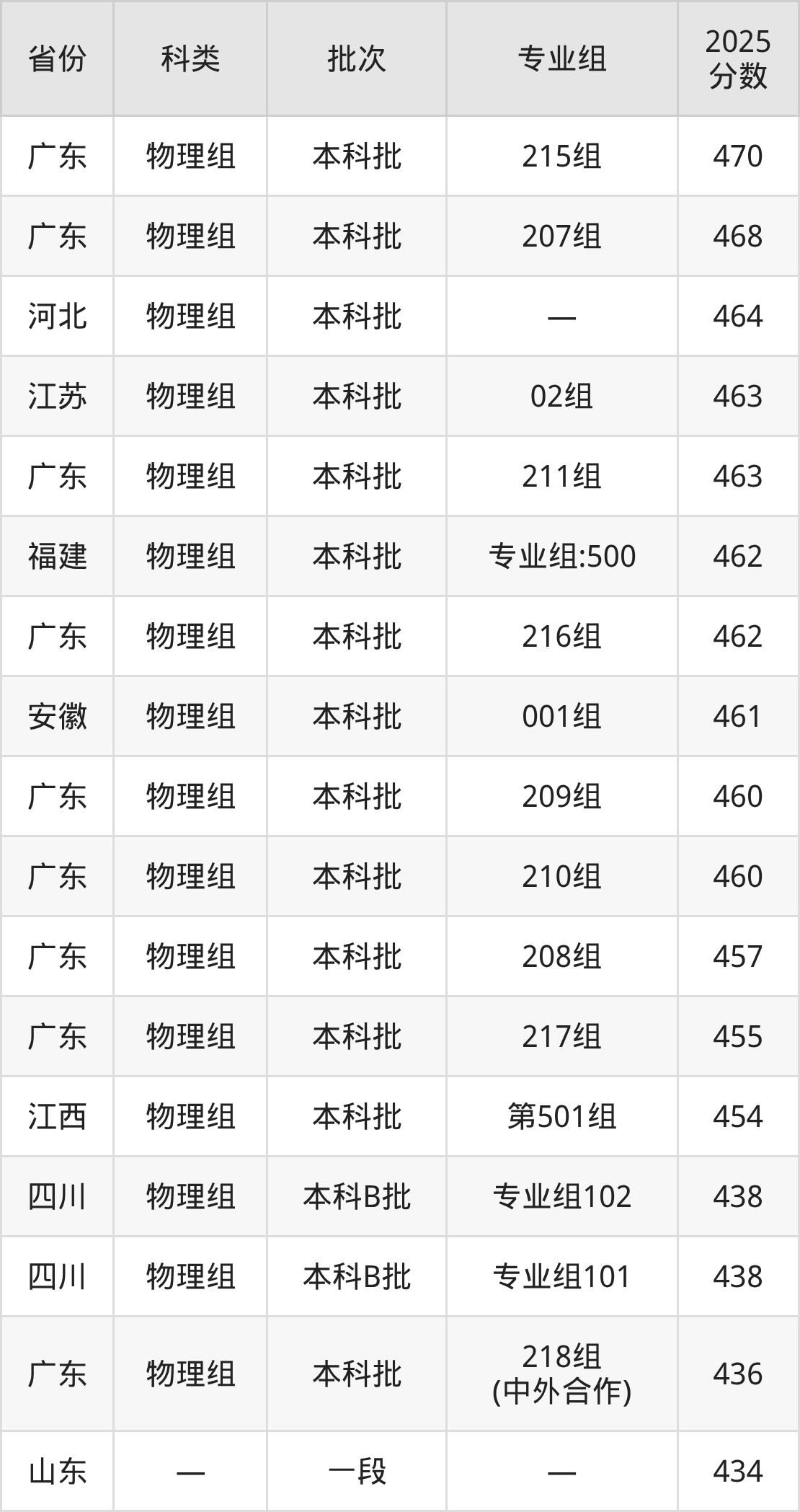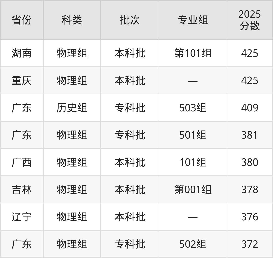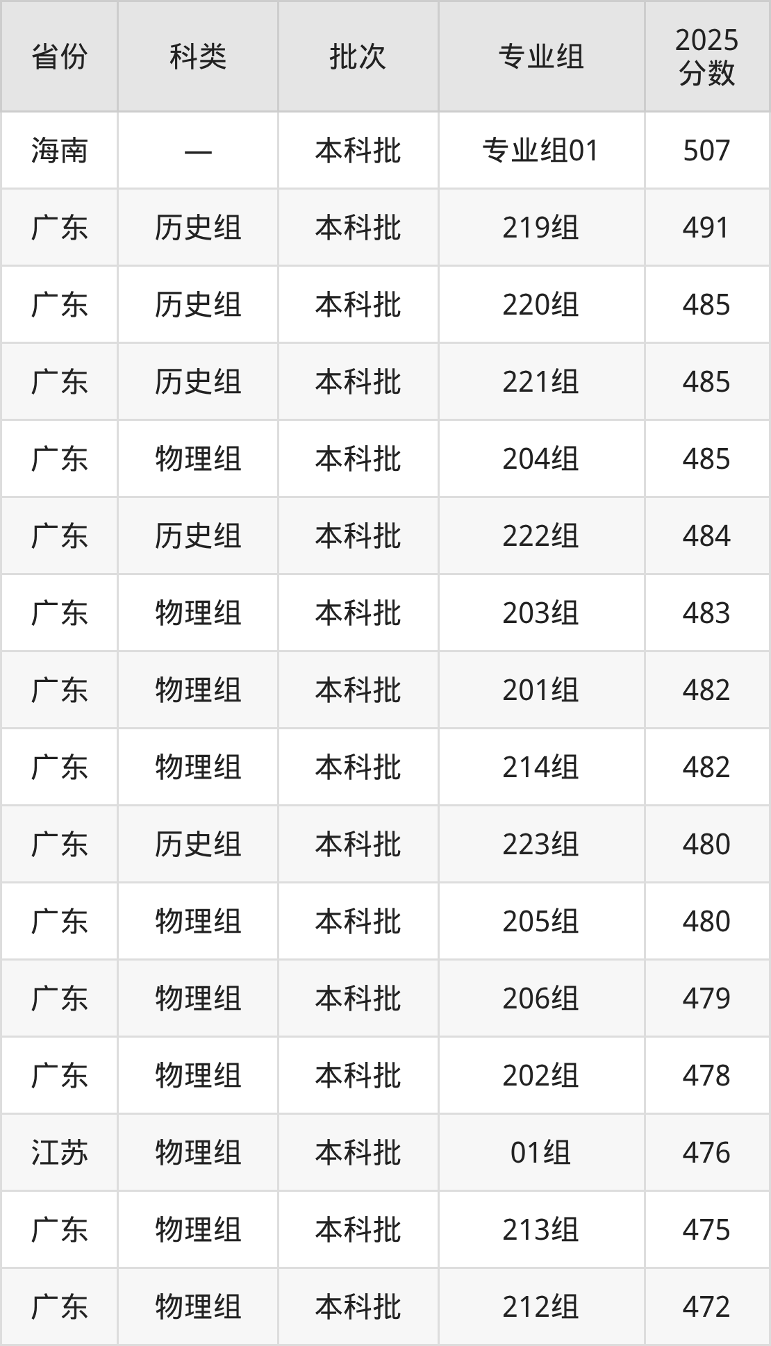 2025年广东东软学院在全国普通批次招生的录取分数范围位于372~507分之间,其中省内分数范围为372分~491分,历史组最低分专业组为“503组”,考生409分即可报考,物理组最低分专业组为“502组”,考生372分即可报考。