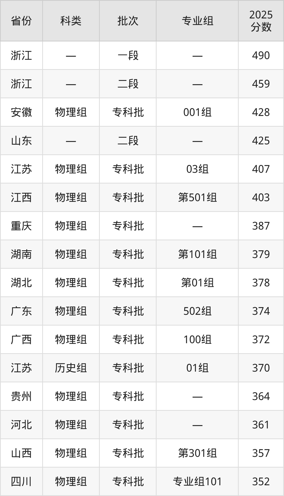 而浙江地区考生的分数门槛最高,2025年江苏建筑职业技术学院在浙江招生最低分为490分,考生至少要超一段线0分才有可能被录取。
