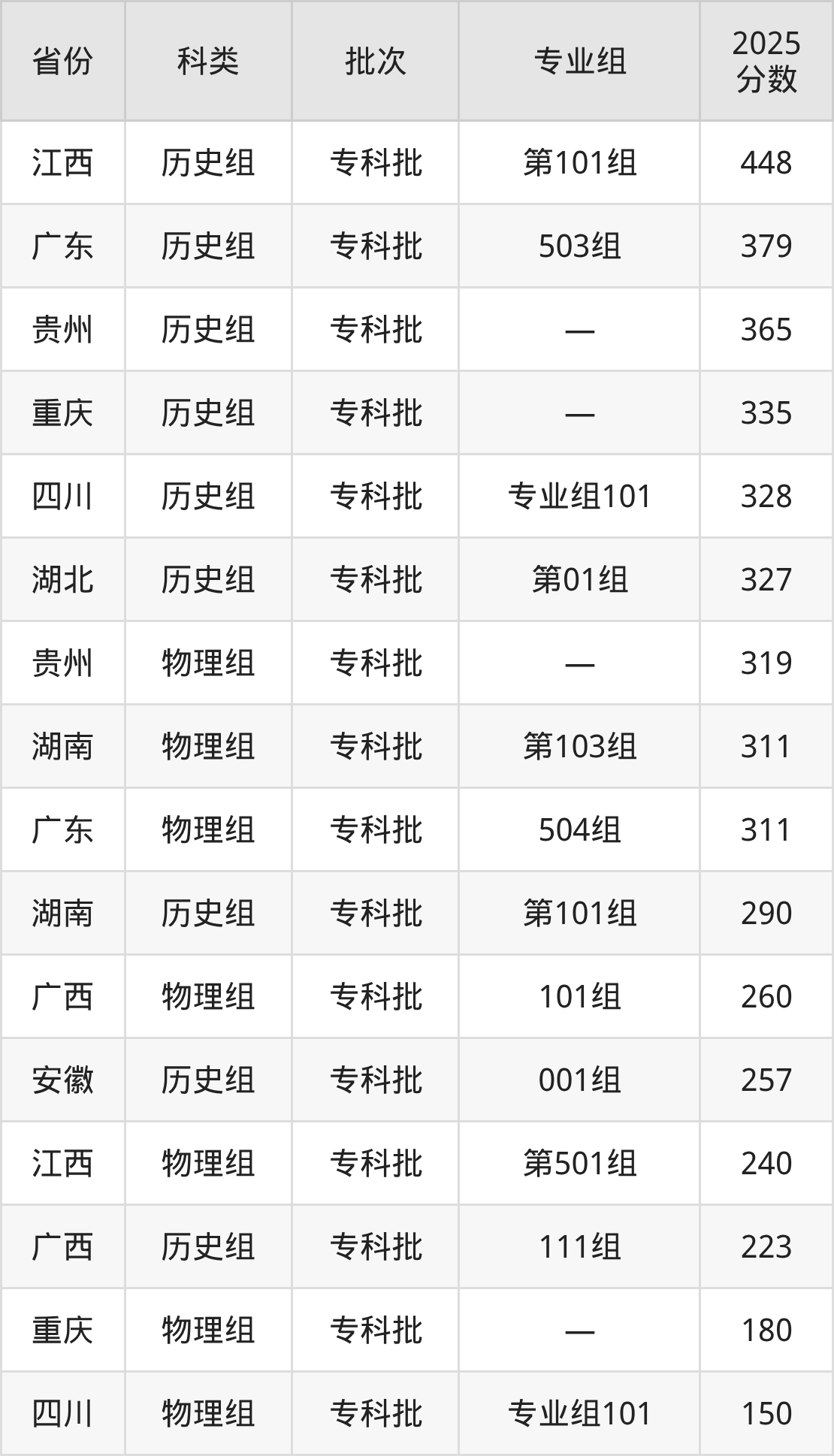 而江西地区历史组考生的分数门槛最高,2025年湘中幼儿师范高等专科学校第101组在江西招生最低分为448分,考生至少要超专科线158分才有可能被录取。