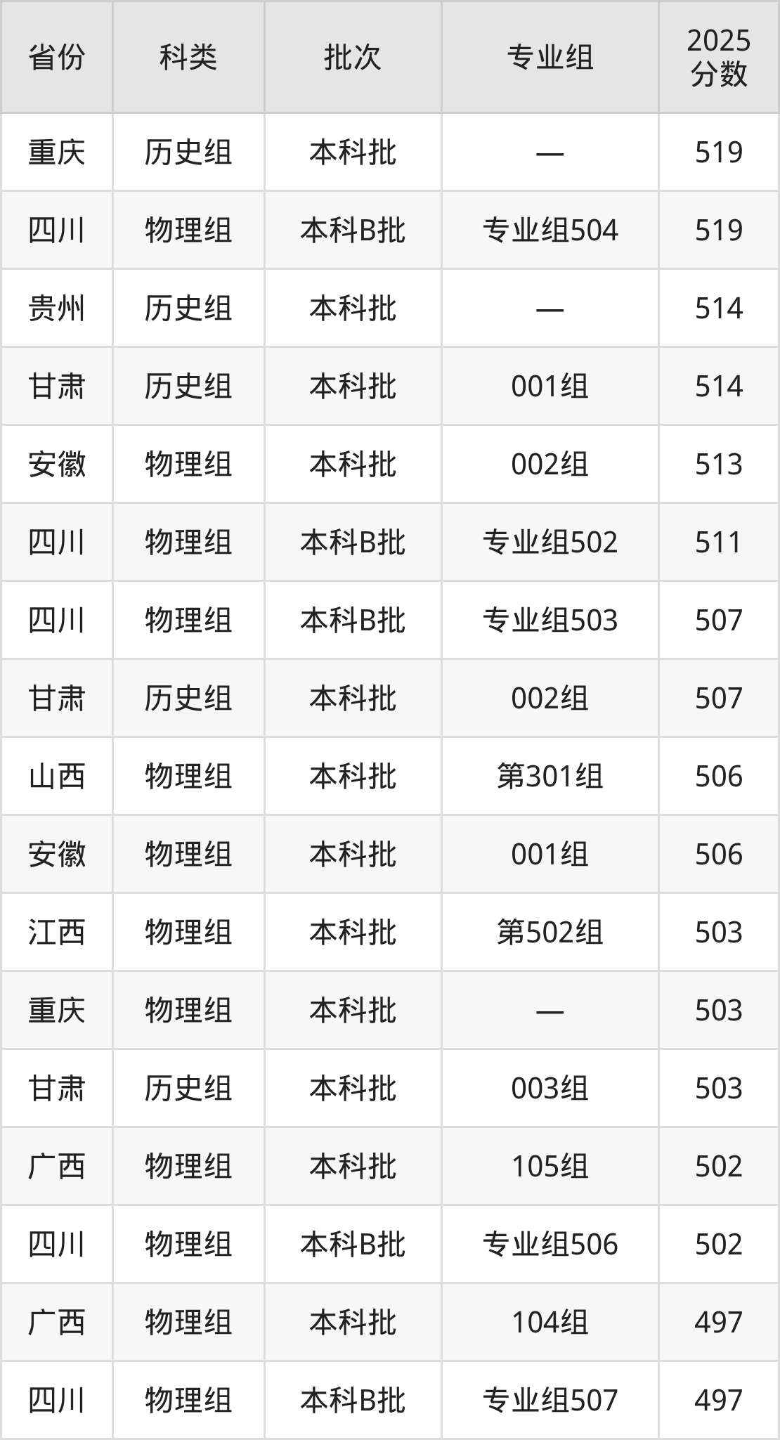 2025年内江师范学院在全国普通批次招生的录取分数范围位于423~586分之间,其中省内分数范围为489分~553分,历史组最低分专业组为“专业组103”,考生543分即可报考,物理组最低分专业组为“专业组508(应用本科)”,考生489分即可报考。