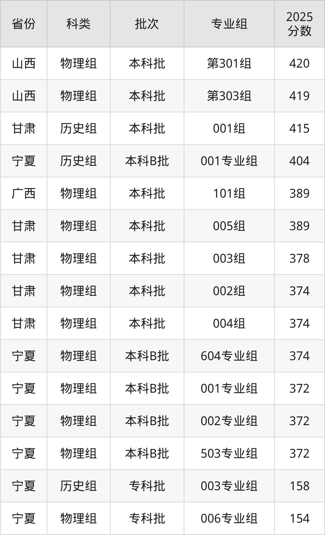 2025年银川能源学院在全国普通批次招生的录取分数范围位于154~485分之间,其中回族自治区内分数范围为154分~404分,物理组最低分专业组为“006专业组”,考生154分即可报考,历史组最低分专业组为“003专业组”,考生158分即可报考。