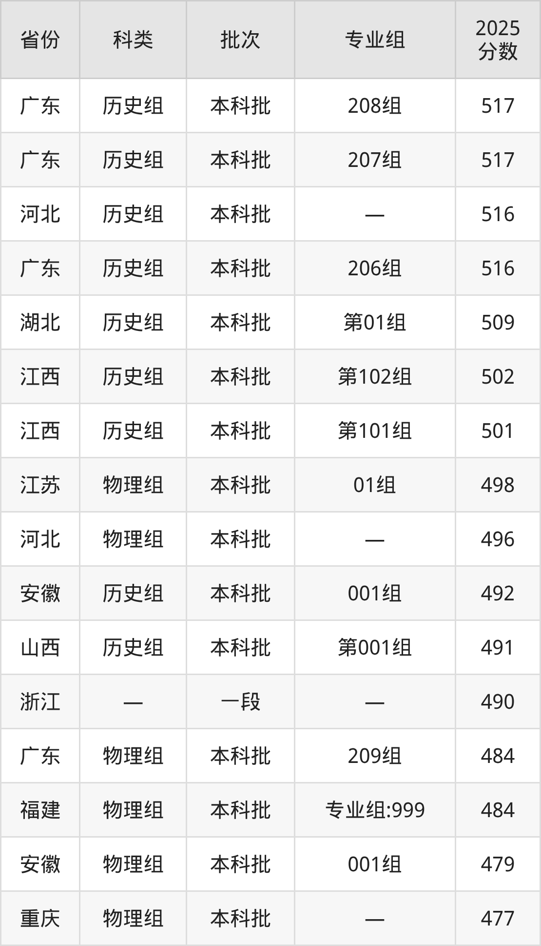 而广东地区历史组考生的分数门槛最高,2025年南昌应用技术师范学院208组在广东招生最低分为517分,考生至少要超本科线53分才有可能被录取。