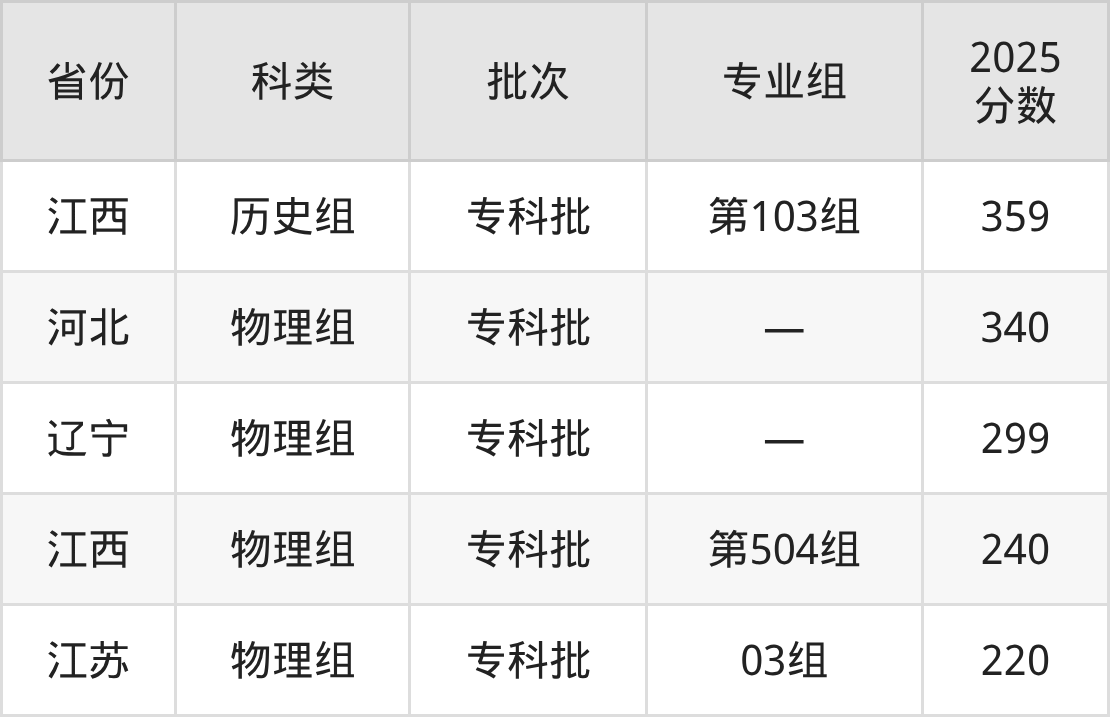 2025年南昌应用技术师范学院在全国普通批次招生的录取分数范围位于220~517分之间,其中省内分数范围为240分~502分,历史组最低分专业组为“第103组”,考生359分即可报考,物理组最低分专业组为“第504组”,考生240分即可报考。