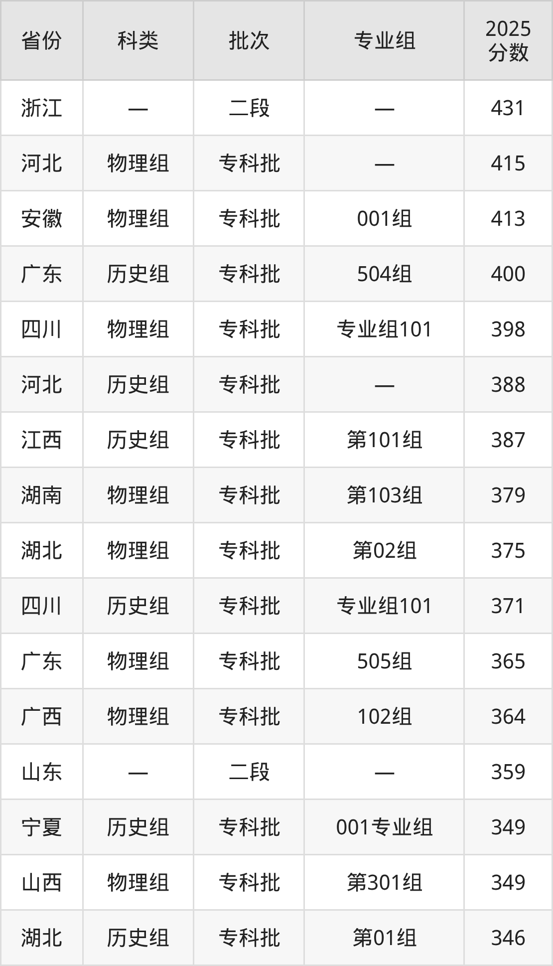 而浙江地区考生的分数门槛最高,2025年江西工业工程职业技术学院在浙江招生最低分为431分,考生至少要超二段线163分才有可能被录取。