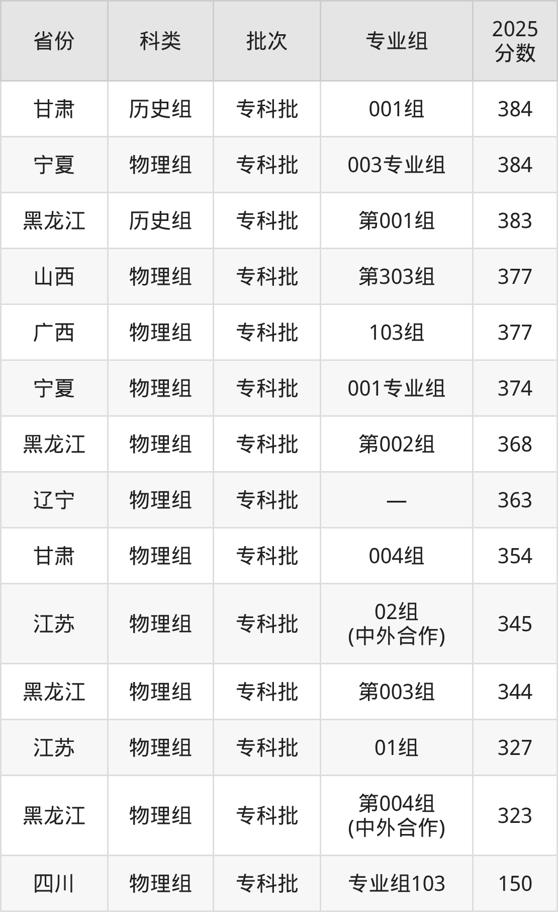 重庆工程职业技术学院在市外招生的最低分为150分,其中四川地区物理组考生上重庆工程职业技术学院的分数门槛最低,考生成绩达专科线即可报考。其次是黑龙江物理组考生,上重庆工程职业技术学院至少要超专科线163分(323分)。