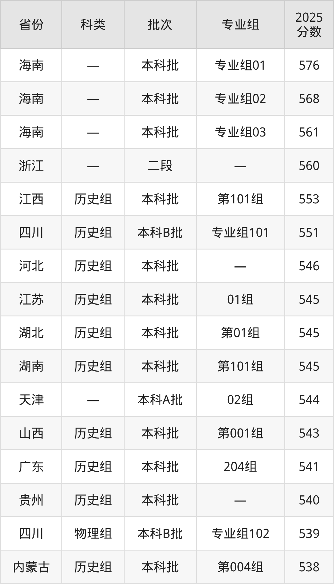 而海南地区考生的分数门槛最高,2025年湖南财政经济学院专业组01在海南招生最低分为576分,考生至少要超本科线96分才有可能被录取。