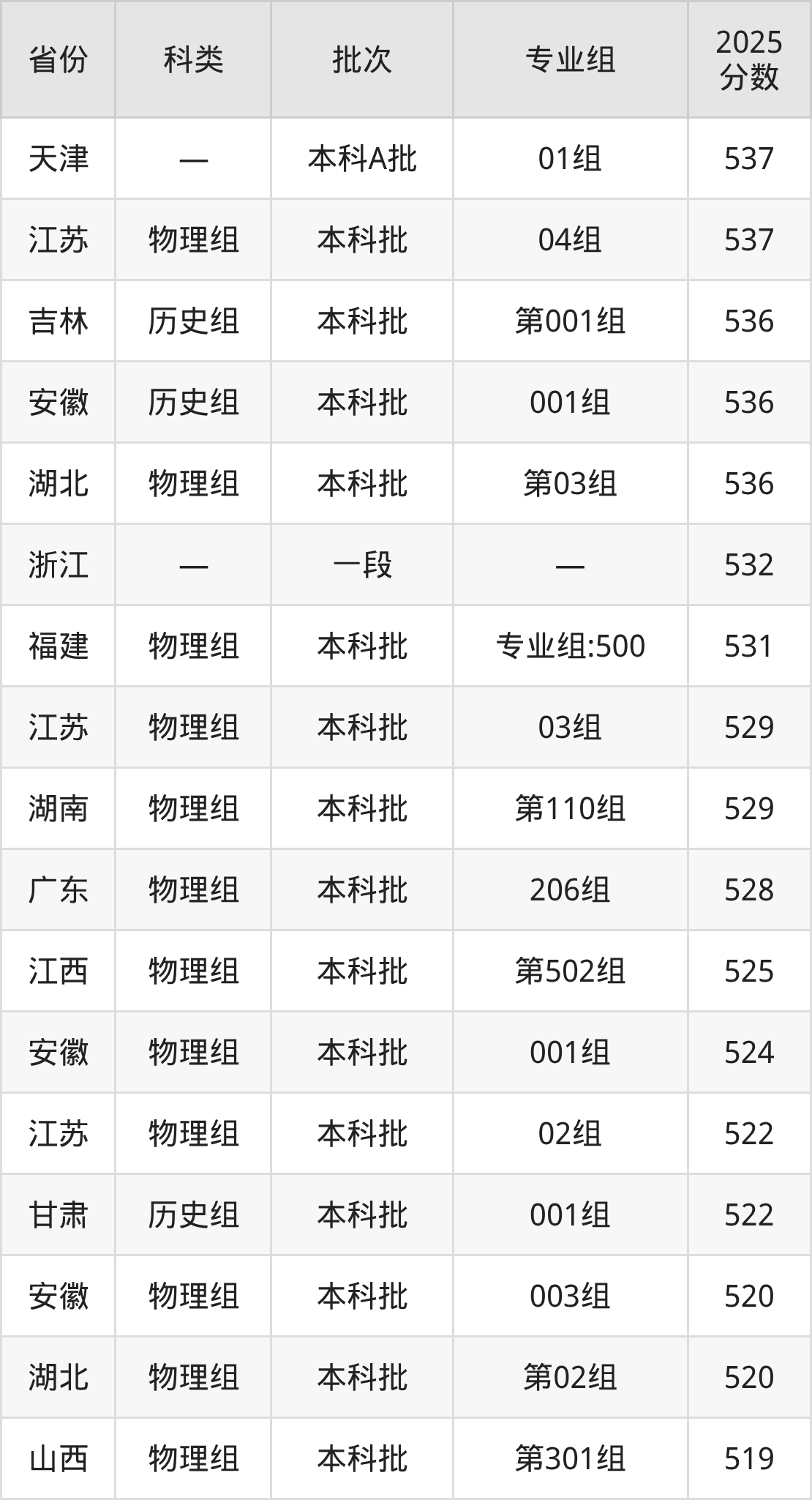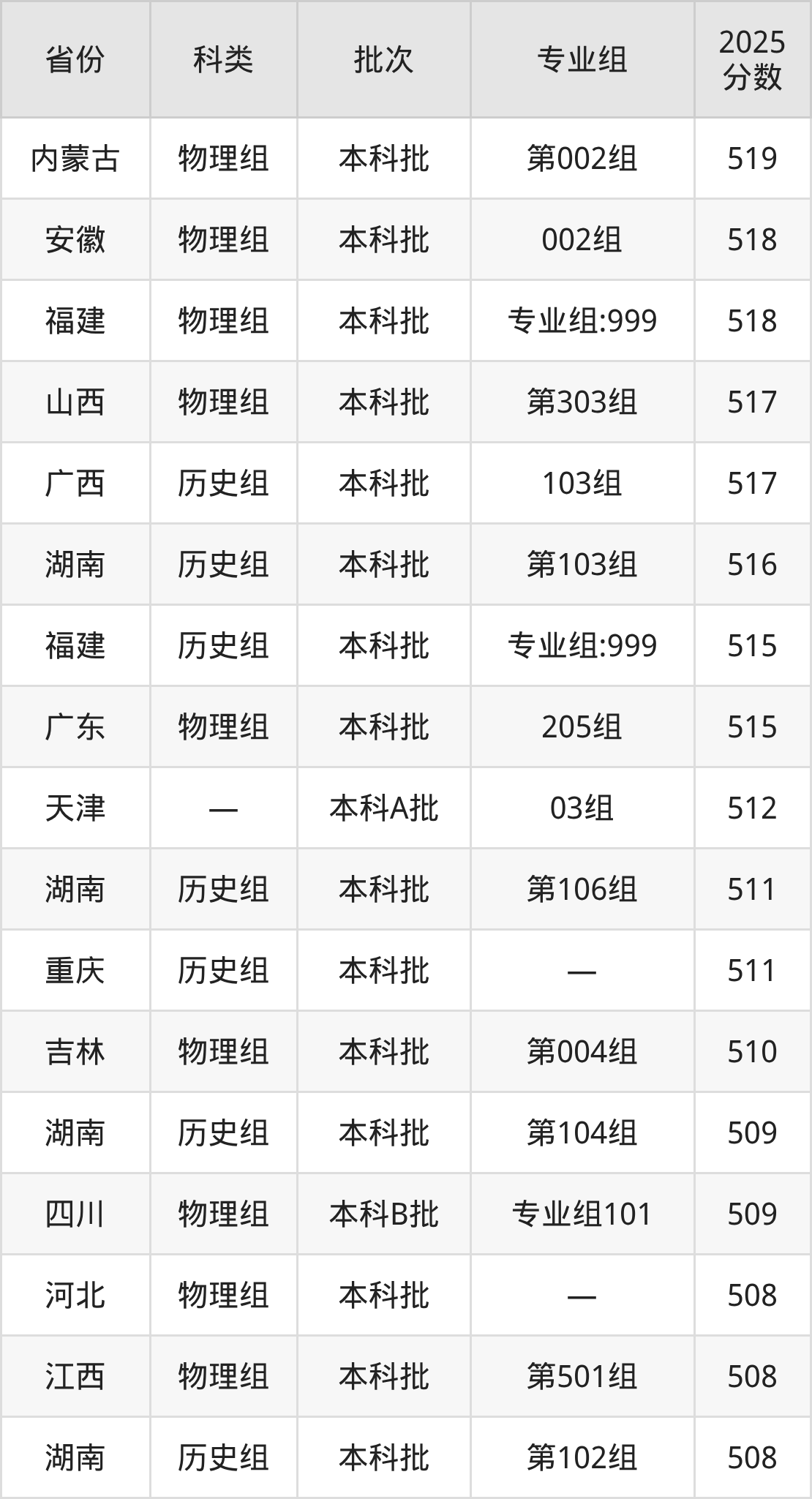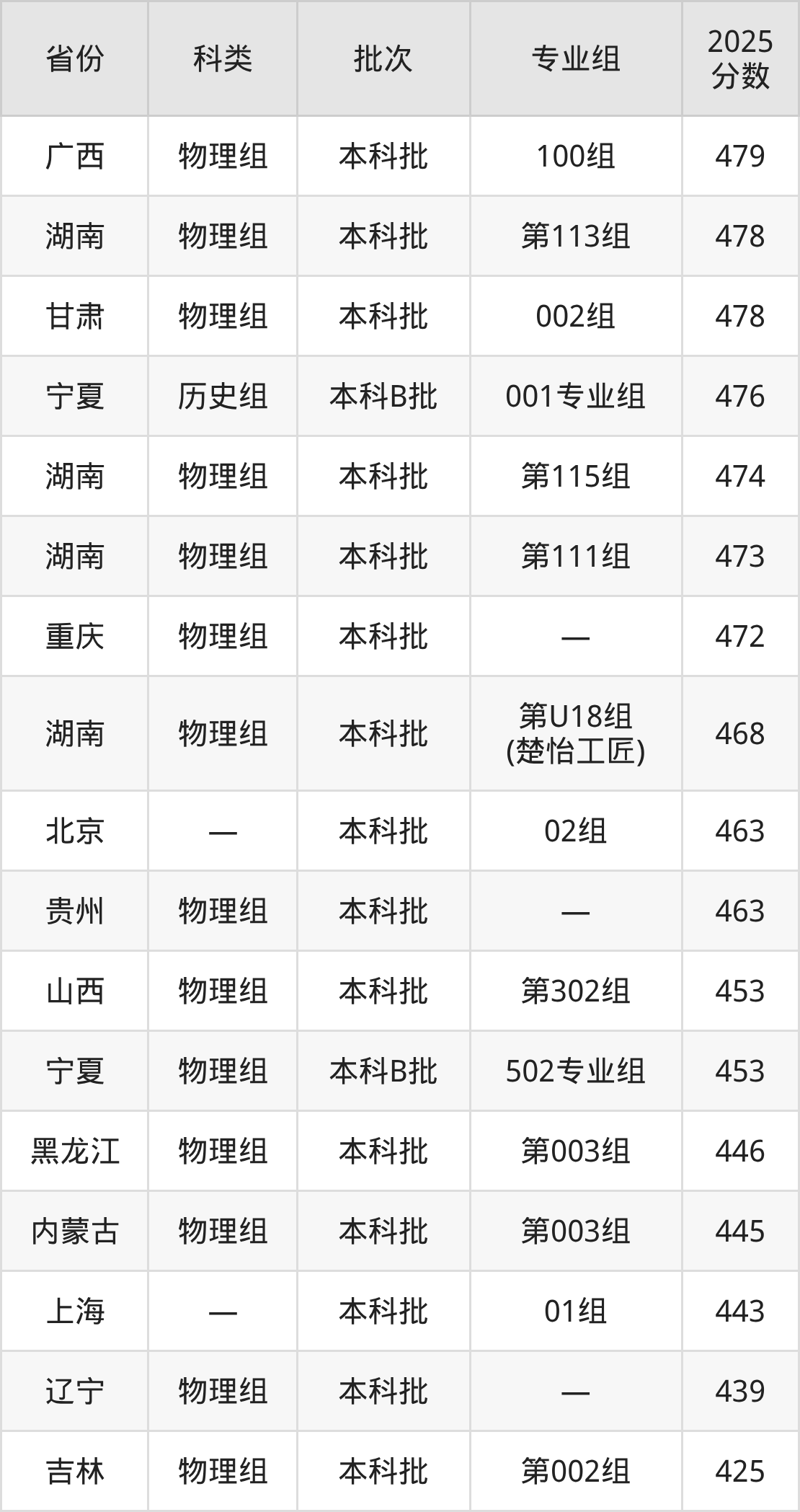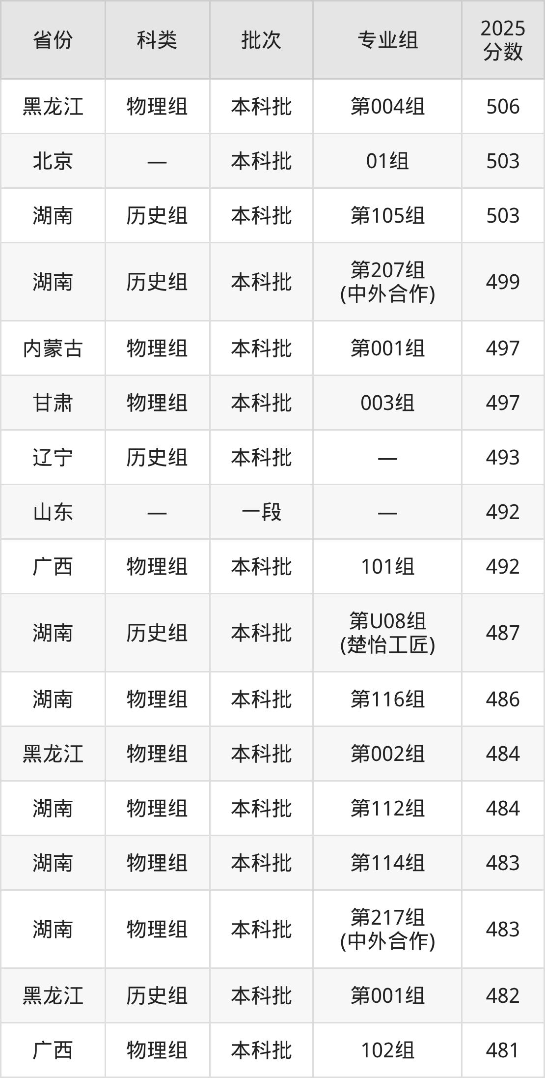 2025年湖南财政经济学院在全国普通批次招生的录取分数范围位于398~576分之间,其中省内分数范围为468分~545分,历史组最低分专业组为“第U08组(楚怡工匠)”,考生487分即可报考,物理组最低分专业组为“第U18组(楚怡工匠)”,考生468分即可报考。