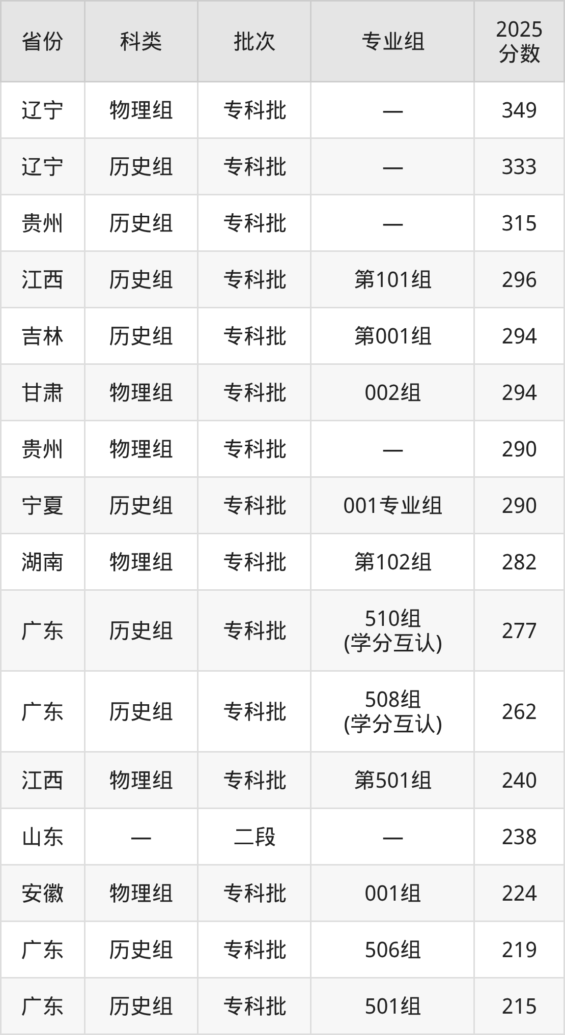 2025年广东文理职业学院在全国普通批次招生的录取分数范围位于150~349分之间,其中省内分数范围为200分~277分,历史组最低分专业组为“501组”,考生215分即可报考,物理组最低分专业组为“502组”,考生200分即可报考。