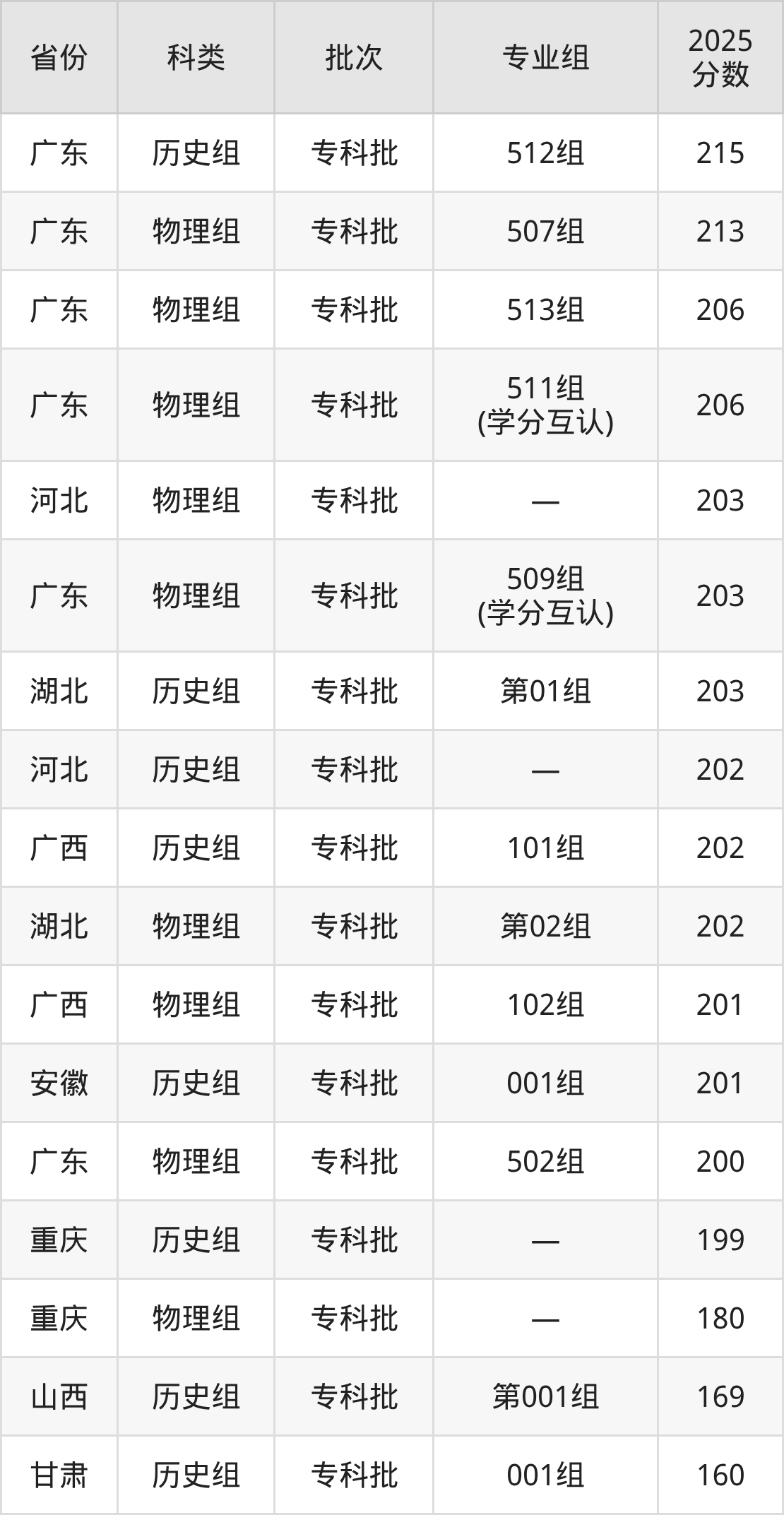 广东文理职业学院在省外招生的最低分为150分,其中四川地区历史组考生上广东文理职业学院的分数门槛最低,考生成绩达专科线即可报考。其次是甘肃历史组考生,上广东文理职业学院至少要超专科线0分(160分)。