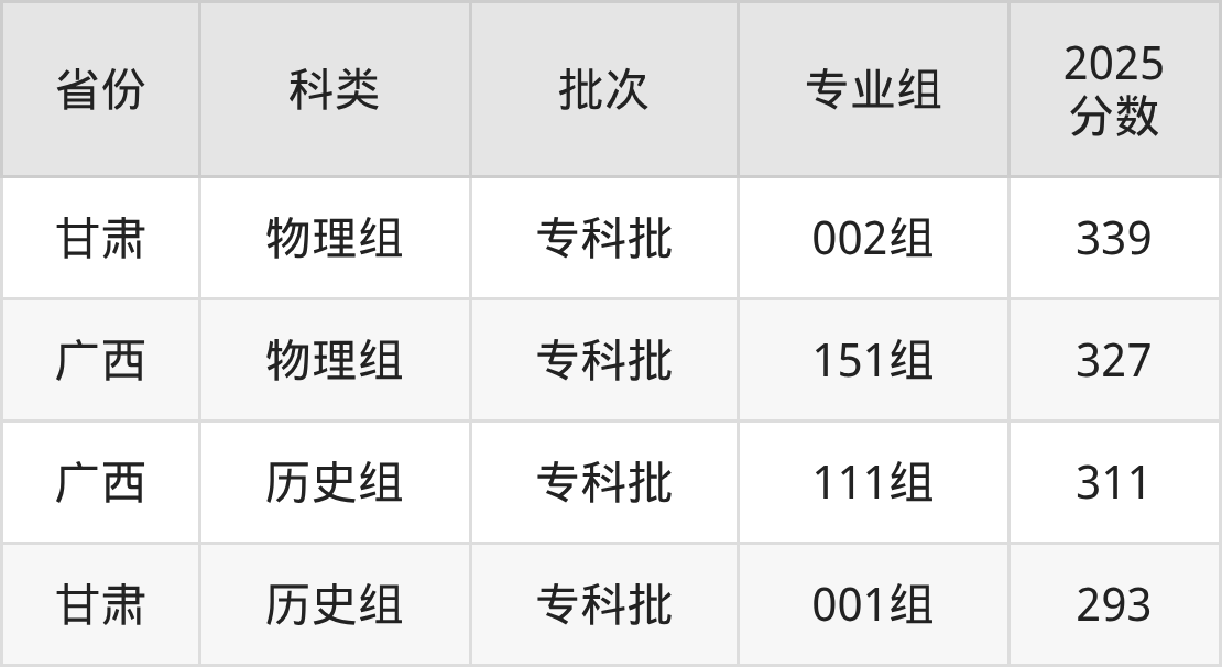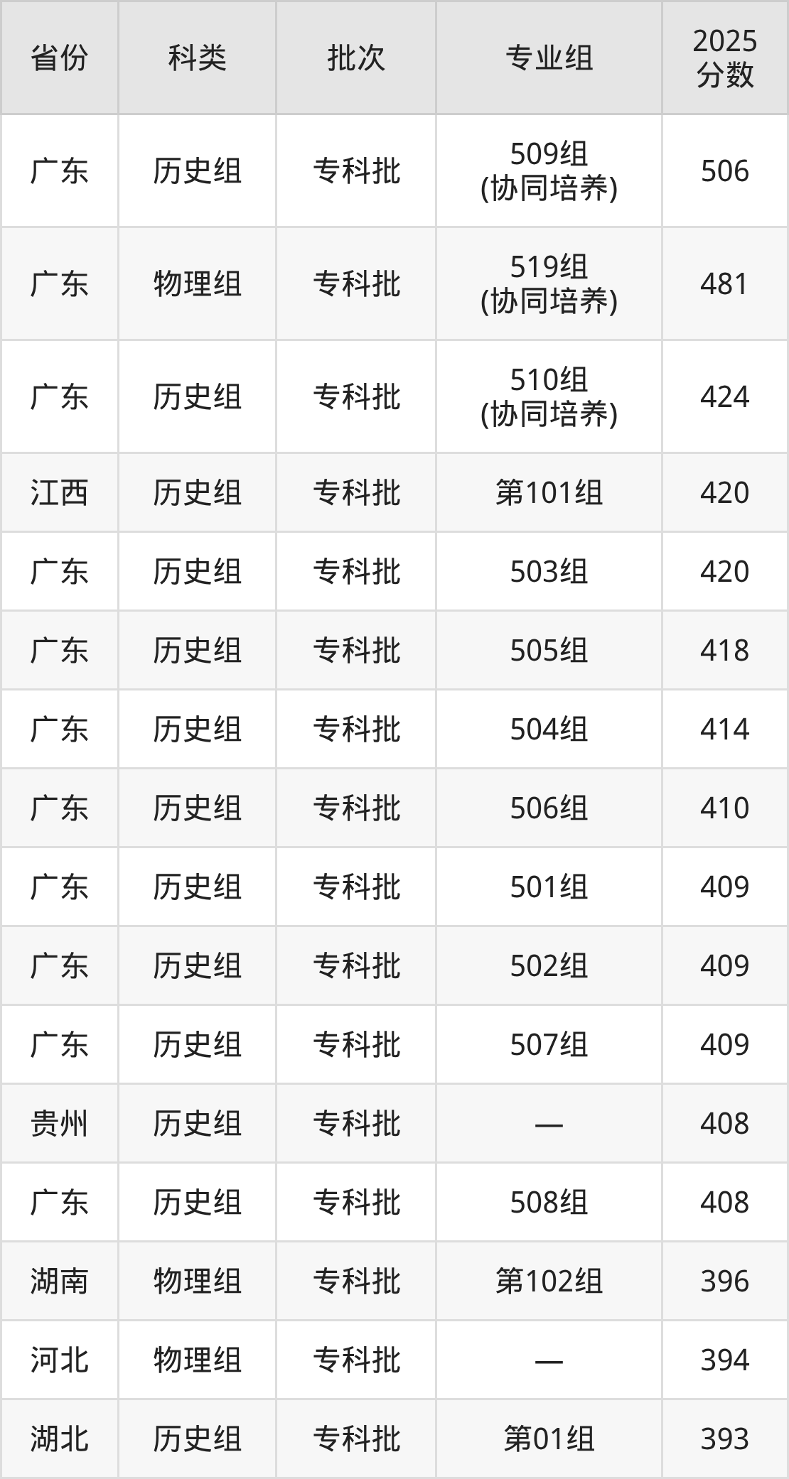 而江西地区历史组考生的分数门槛最高,2025年茂名职业技术学院第101组在江西招生最低分为420分,考生至少要超专科线130分才有可能被录取。