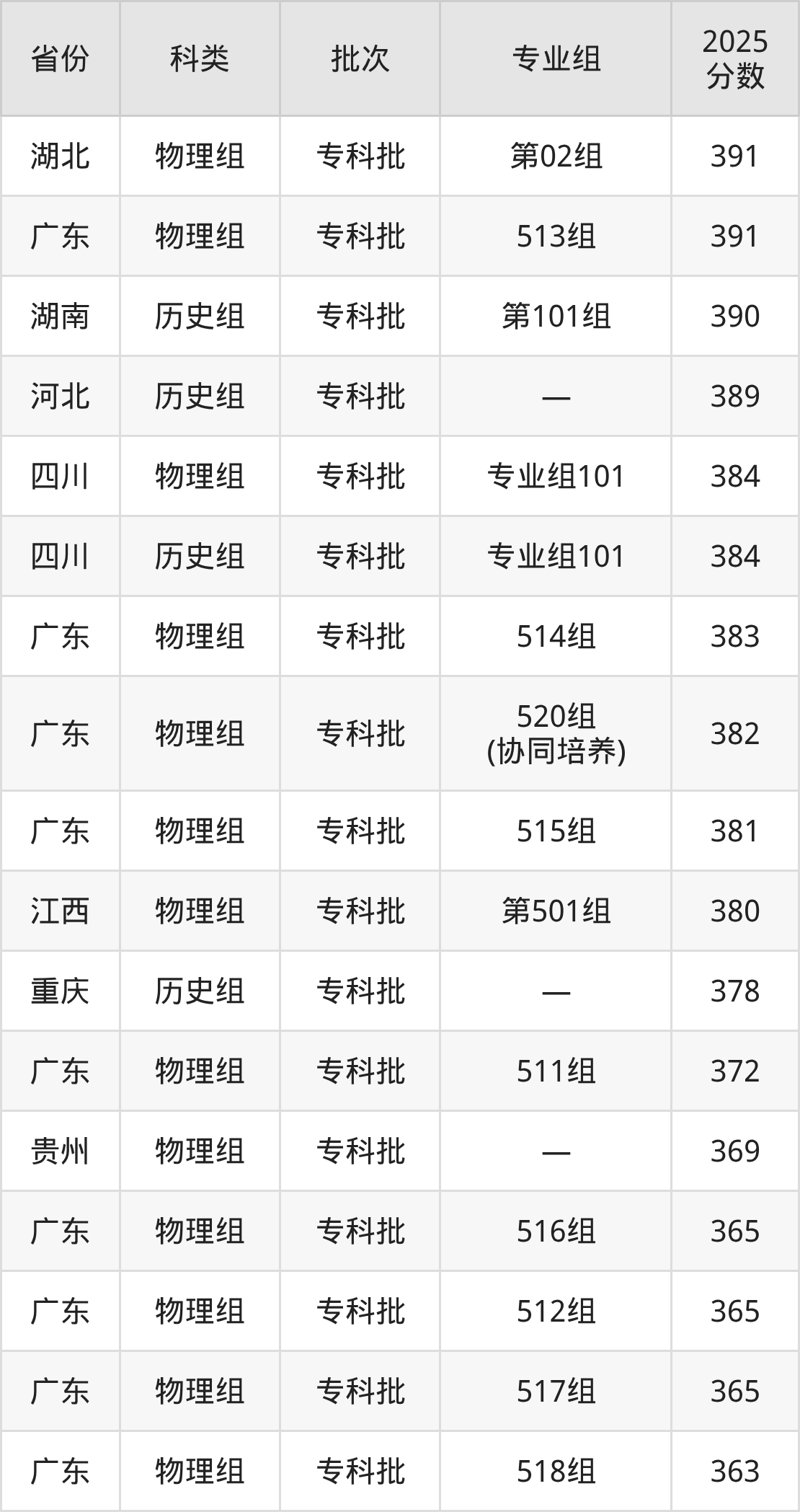 下面是茂名职业技术学院2025年在全国各省的录取分数线一览表,供参考: