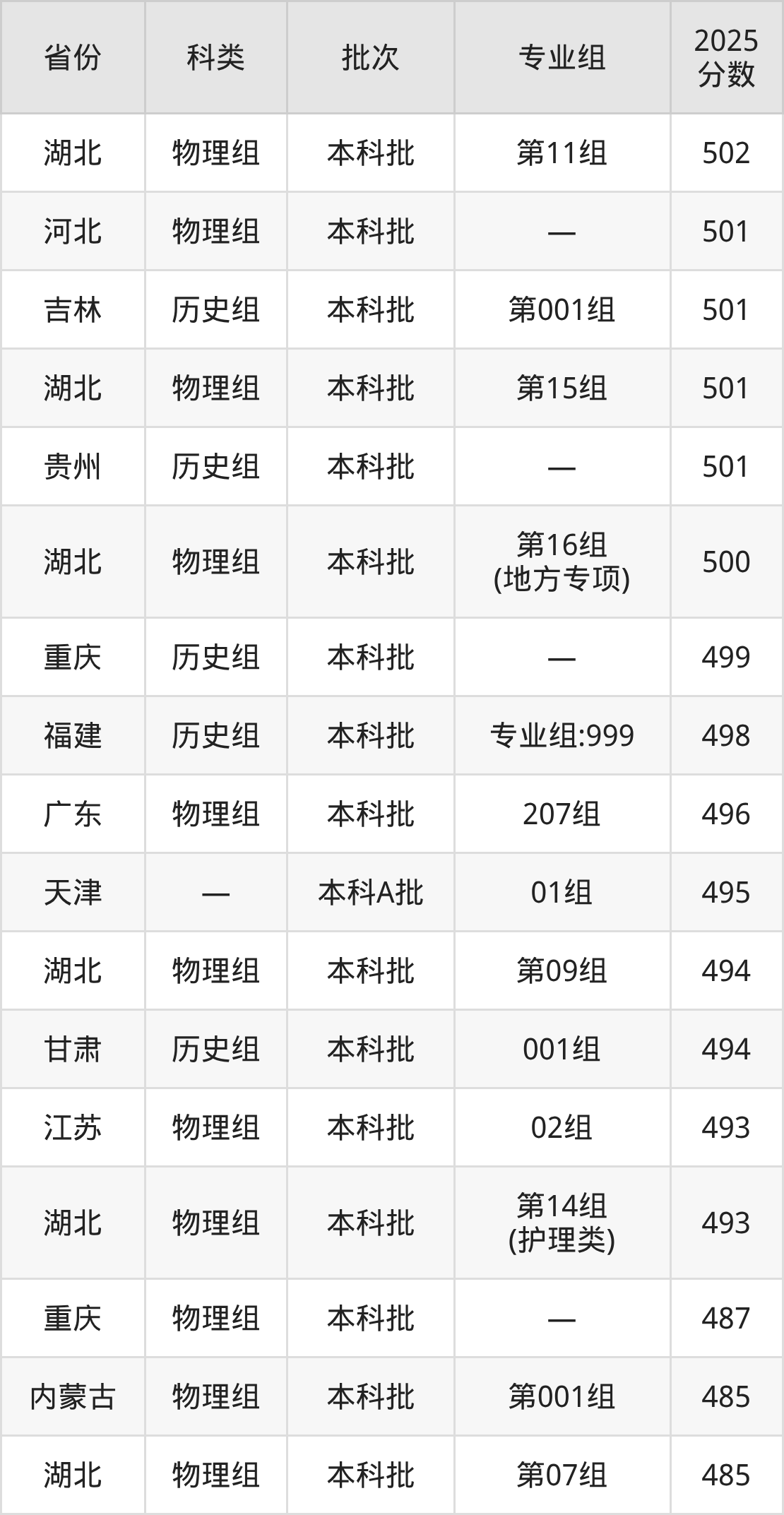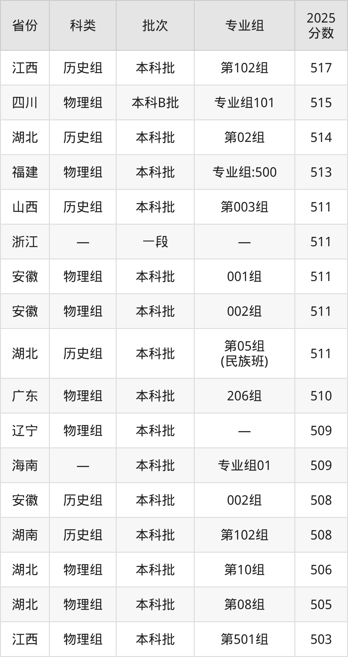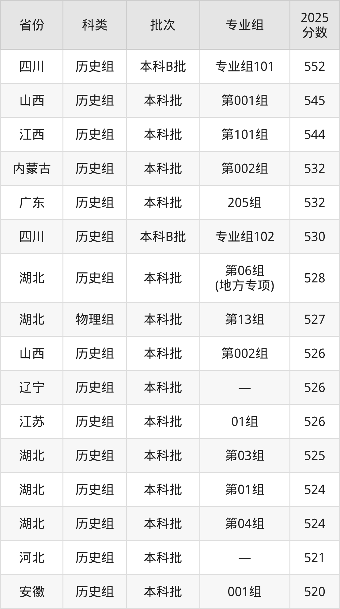 2025年湖北文理学院在全国普通批次招生的录取分数范围位于386~552分之间,其中省内分数范围为485分~528分,物理组最低分专业组为“第07组”,考生485分即可报考,历史组最低分专业组为“第05组(民族班)”,考生511分即可报考。