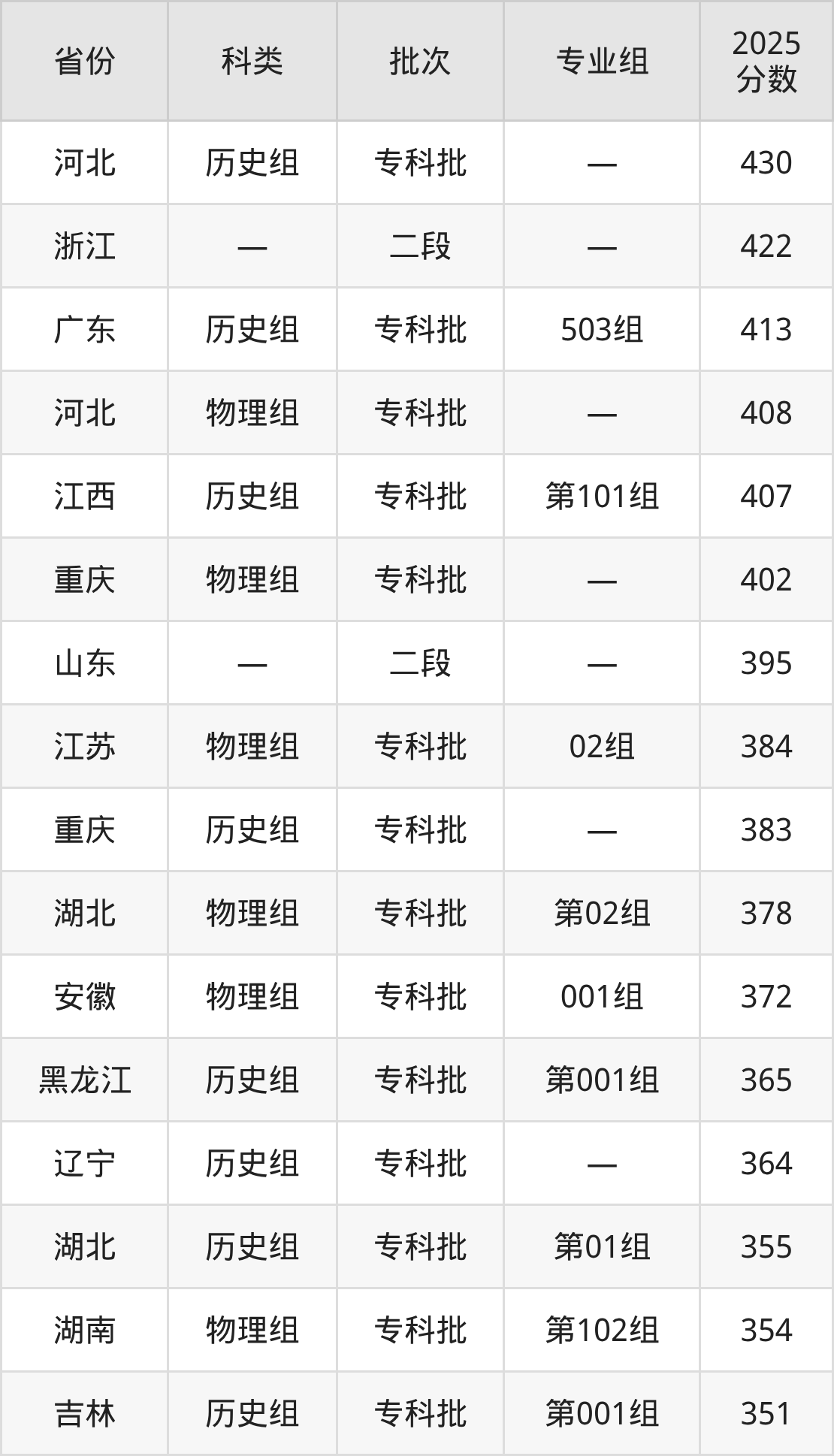 而河北地区历史组考生的分数门槛最高,2025年天津国土资源和房屋职业学院在河北招生最低分为430分,考生至少要超专科线230分才有可能被录取。