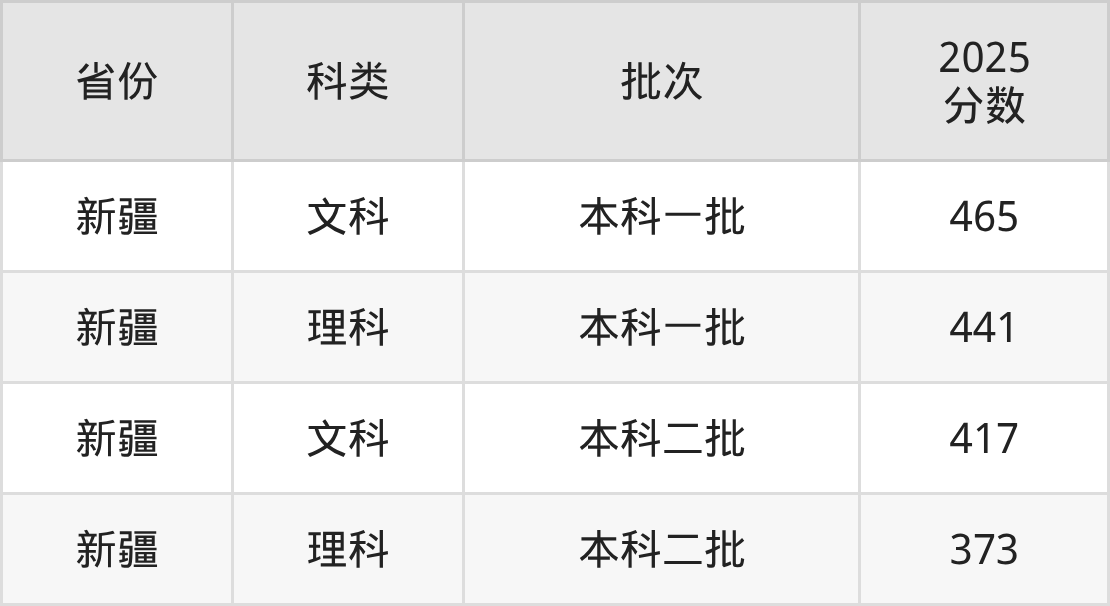 2025年新疆财经大学在全国普通批次招生的录取分数范围位于373~465分之间,其中维吾尔自治区内分数范围为373分~465分,文科考生417分即可报考,理科考生373分即可报考。