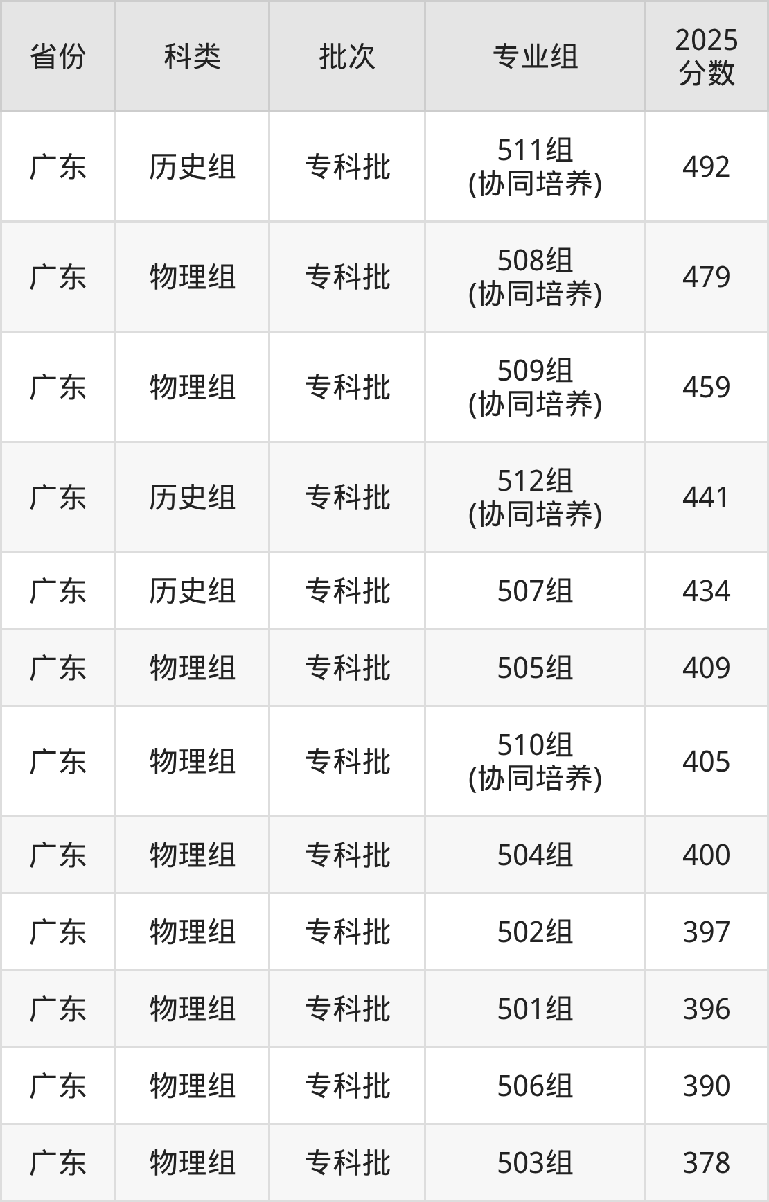 2025年广东邮电职业技术学院在全国普通批次招生的录取分数范围位于378~492分之间,其中省内分数范围为378分~492分,历史组最低分专业组为“507组”,考生434分即可报考,物理组最低分专业组为“503组”,考生378分即可报考。