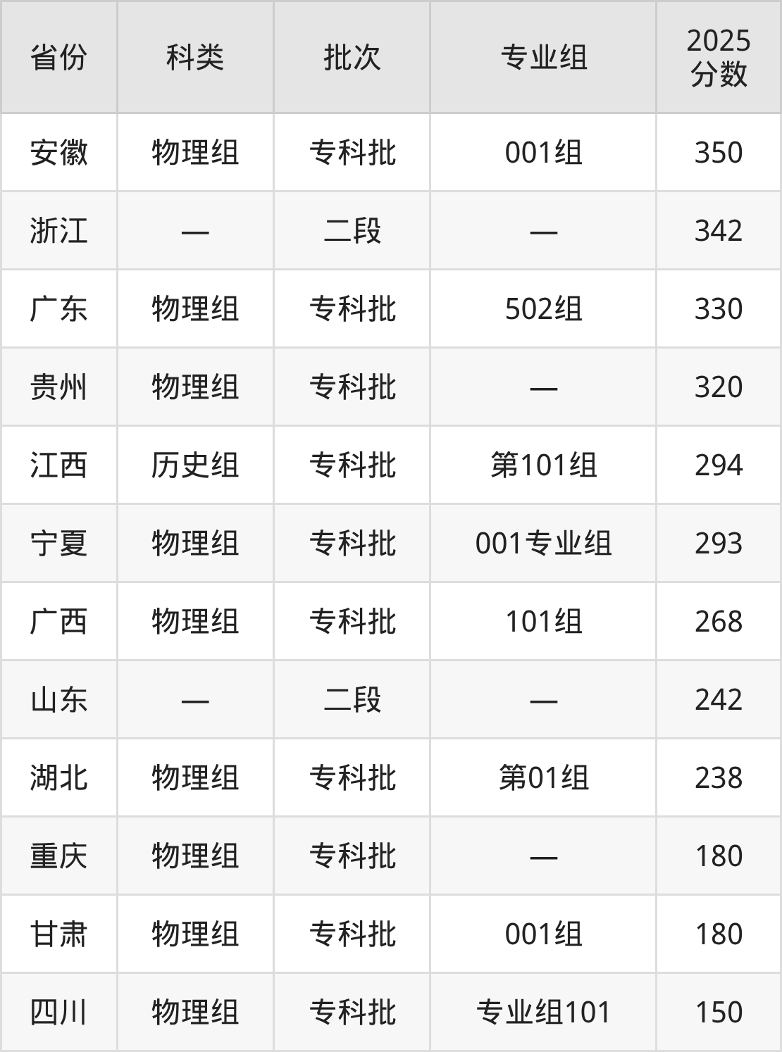 而安徽地区物理组考生的分数门槛最高,2025年广西科技职业学院001组在安徽招生最低分为350分,考生至少要超专科线150分才有可能被录取。