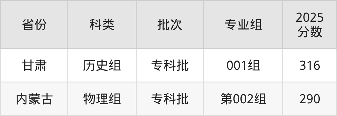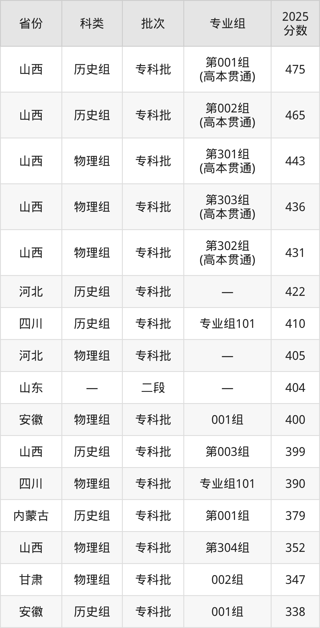 2025年山西省财政税务专科学校在全国普通批次招生的录取分数范围位于290~475分之间,其中省内分数范围为352分~475分,历史组最低分专业组为“第003组”,考生399分即可报考,物理组最低分专业组为“第304组”,考生352分即可报考。