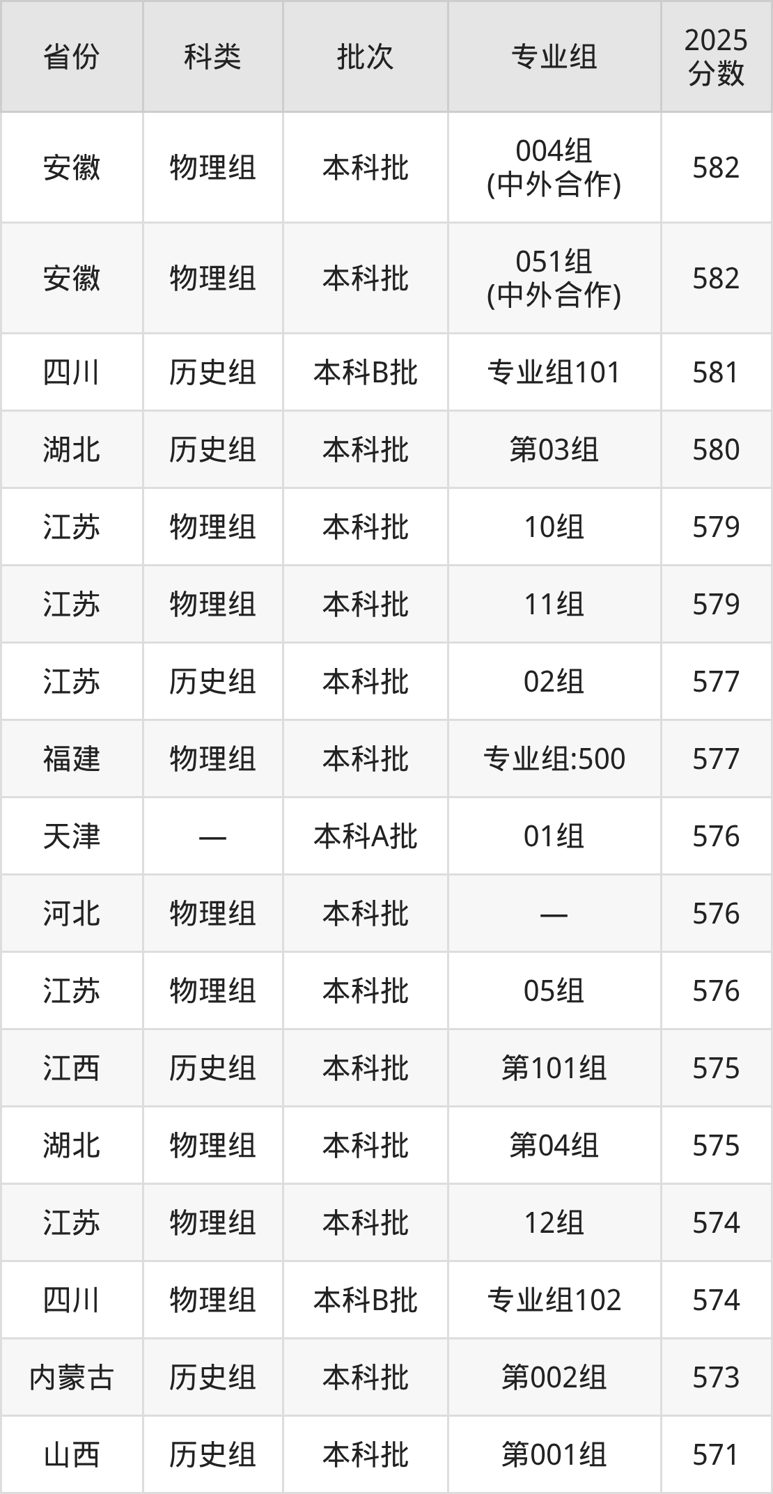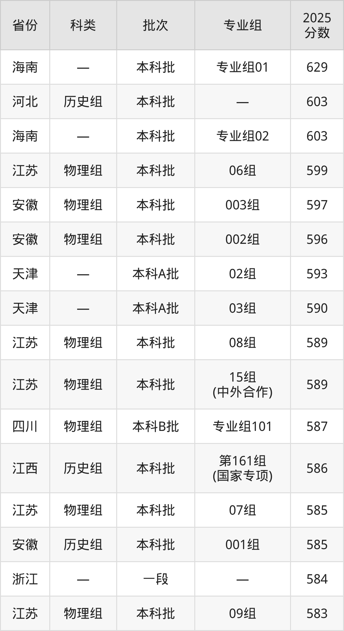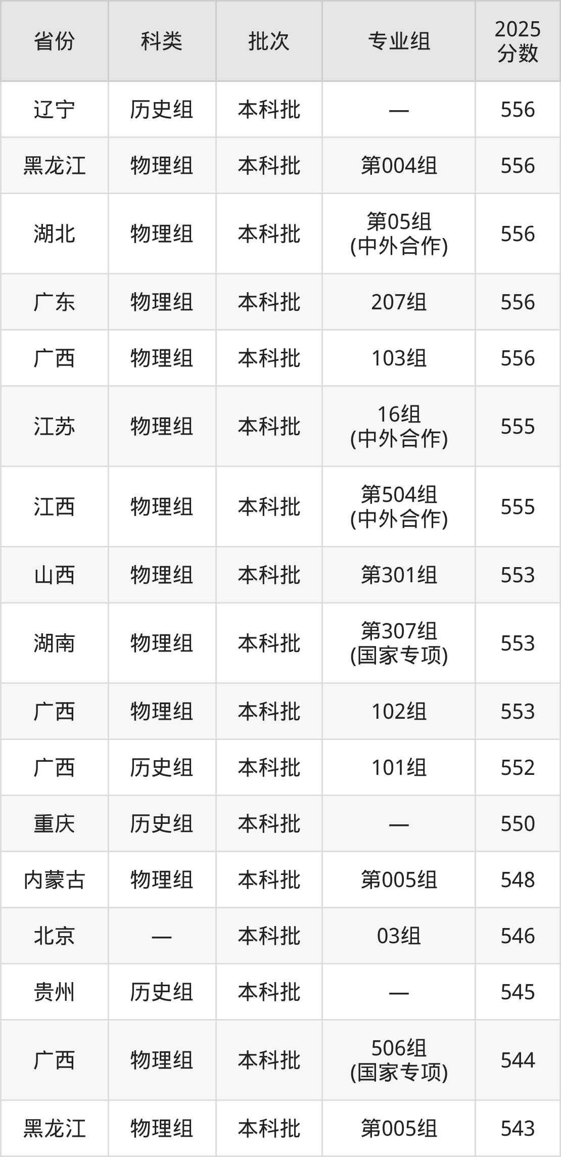 2025年南京工业大学在全国普通批次招生的录取分数范围位于473~629分之间,其中省内分数范围为543分~599分,物理组最低分专业组为“14组(中外合作)”,考生543分即可报考,历史组最低分专业组为“02组”,考生577分即可报考。