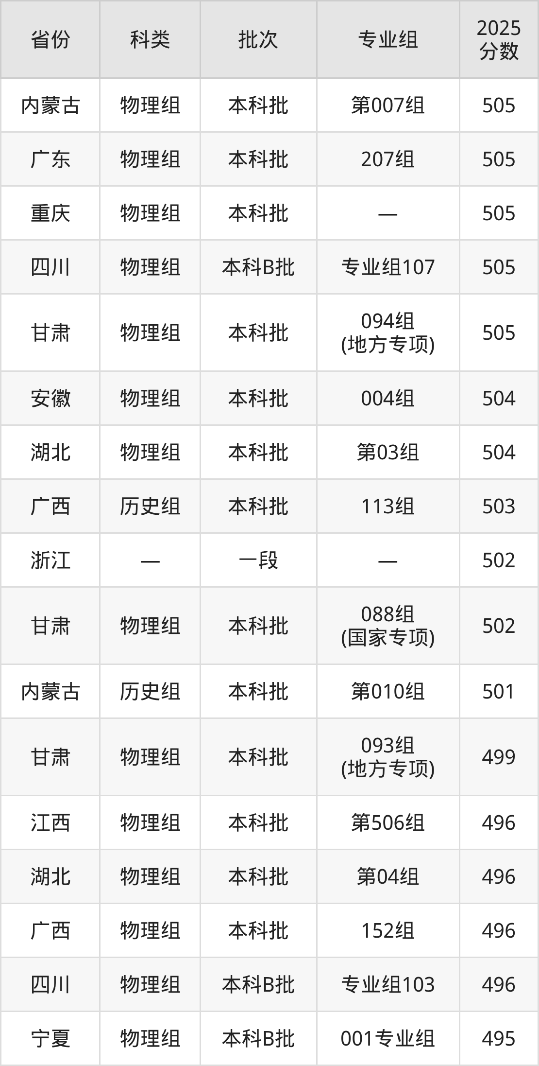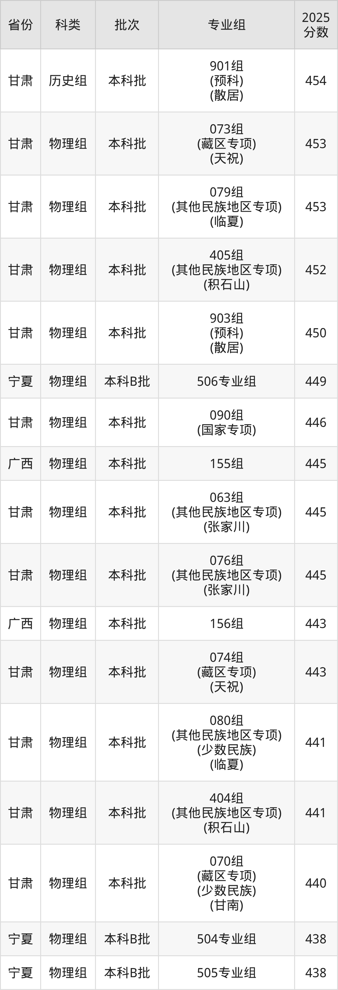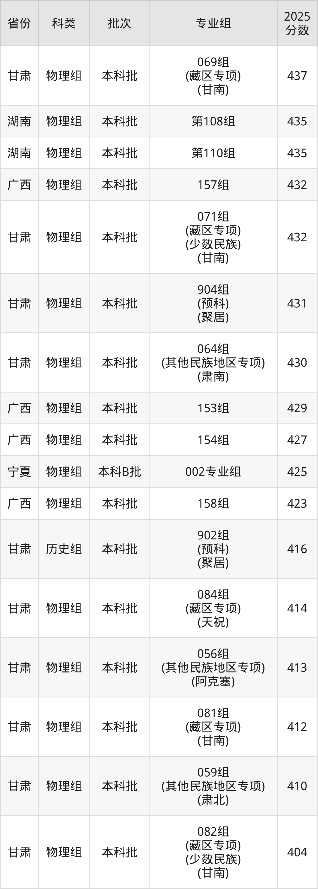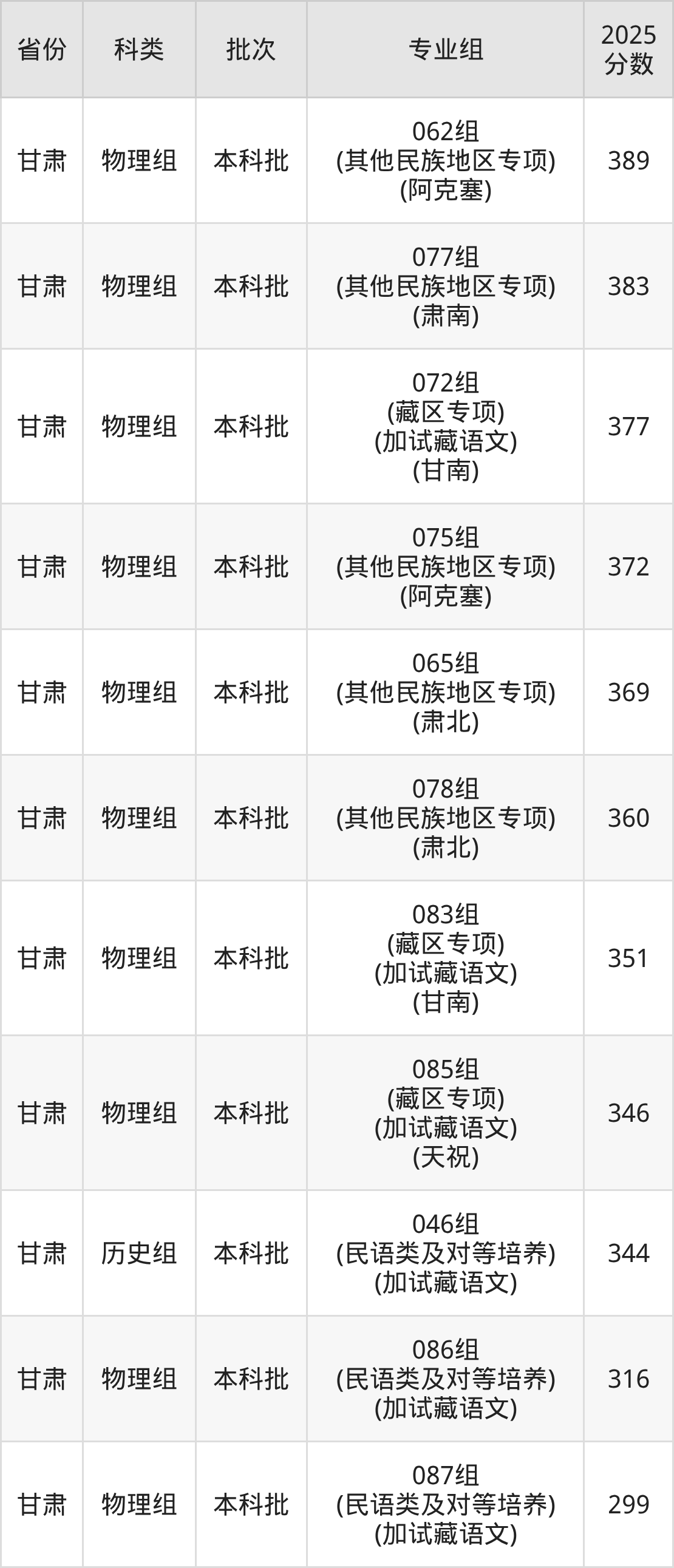 2025年甘肃中医药大学在全国普通批次招生的录取分数范围位于299~606分之间,其中省内分数范围为299分~558分,历史组最低分专业组为“046组(民语类及对等培养)(加试藏语文)”,考生344分即可报考,物理组最低分专业组为“087组(民语类及对等培养)(加试藏语文)”,考生299分即可报考。