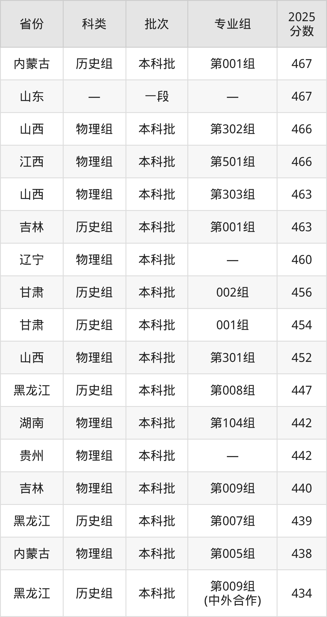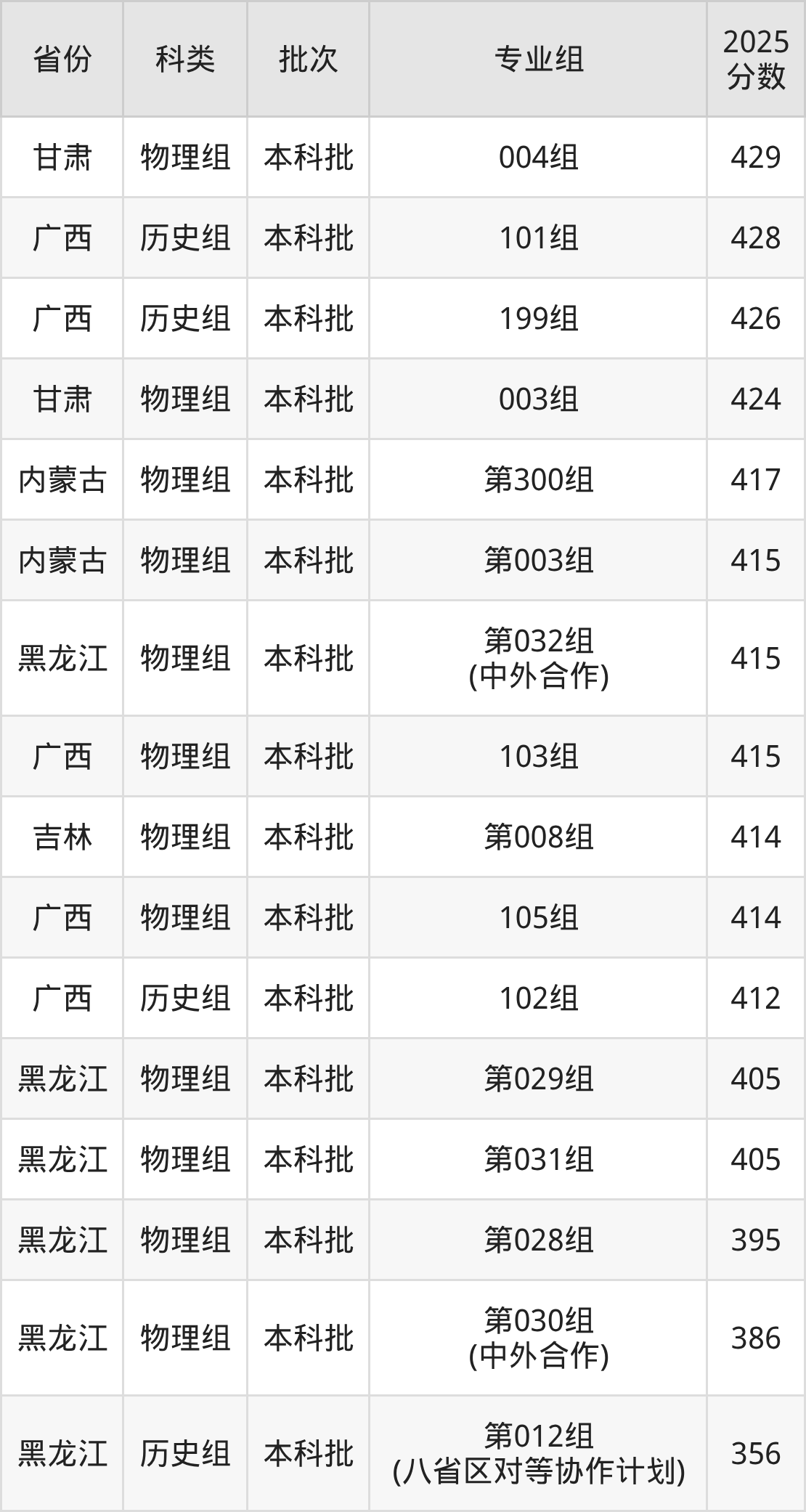 2025年黑河学院在全国普通批次招生的录取分数范围位于356~552分之间,其中省内分数范围为356分~543分,历史组最低分专业组为“第012组(八省区对等协作计划)”,考生356分即可报考,物理组最低分专业组为“第030组(中外合作)”,考生386分即可报考。