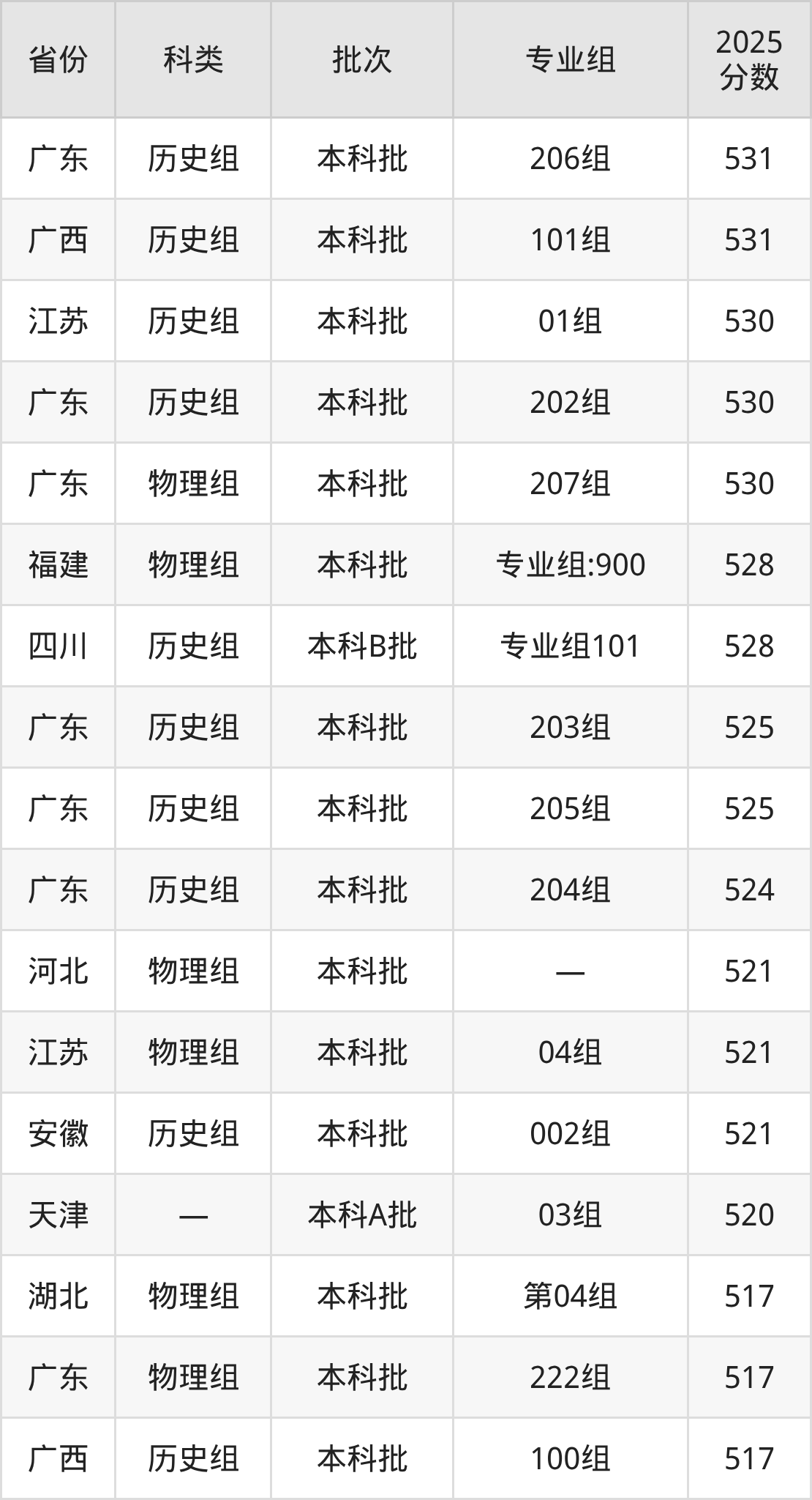 2025年岭南师范学院在全国普通批次招生的录取分数范围位于423~601分之间,其中省内分数范围为474分~539分,历史组最低分专业组为“204组”,考生524分即可报考,物理组最低分专业组为“226组(中外合作)”,考生474分即可报考。