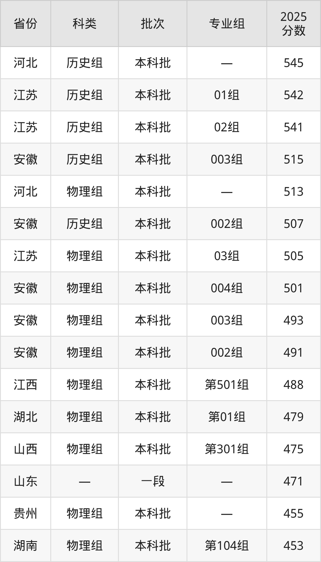 而河北地区历史组考生的分数门槛最高,2025年宿州学院在河北招生最低分为545分,考生至少要超本科线68分才有可能被录取。