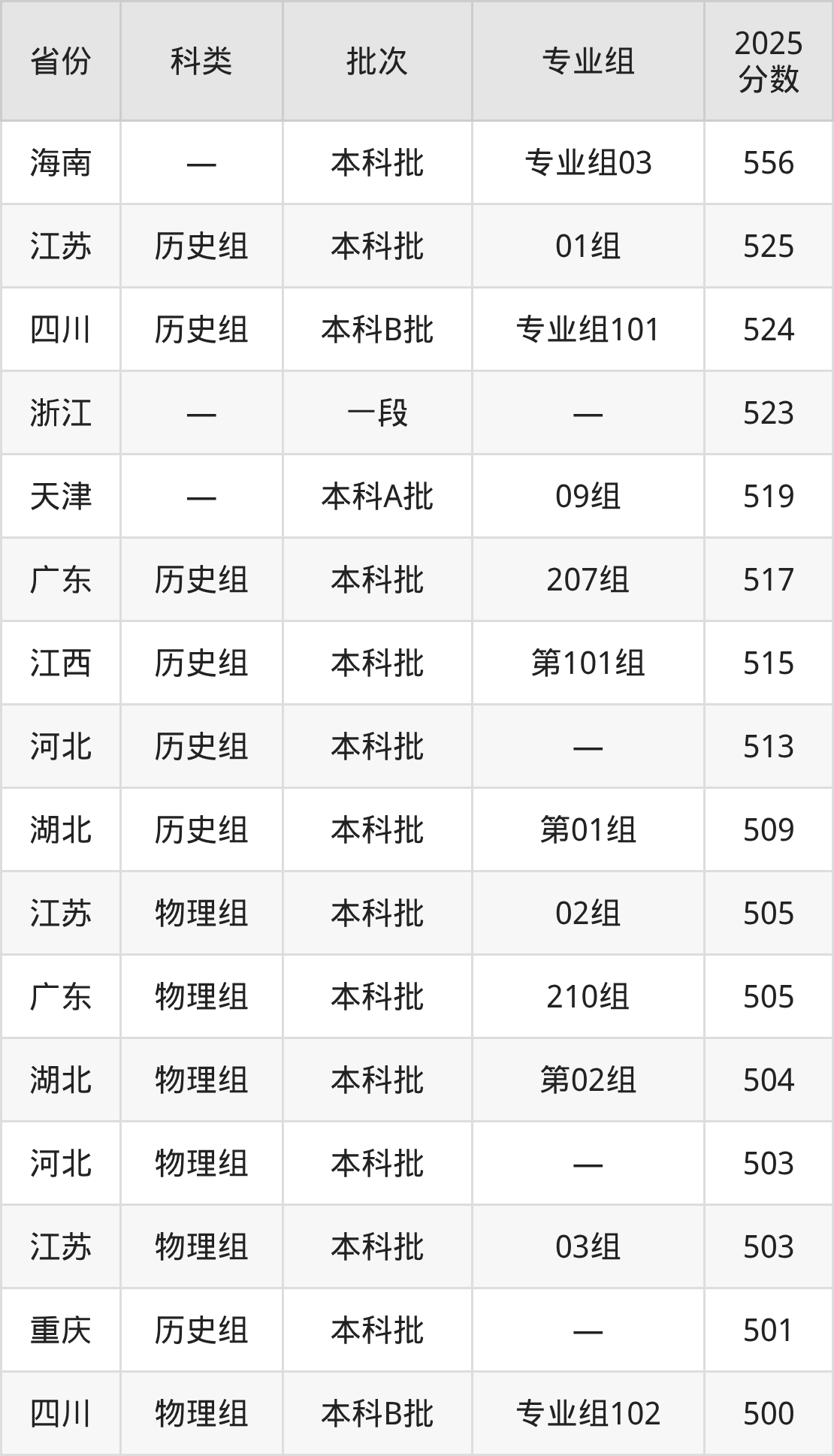 而海南地区考生的分数门槛最高,2025年山西传媒学院专业组03在海南招生最低分为556分,考生至少要超本科线76分才有可能被录取。
