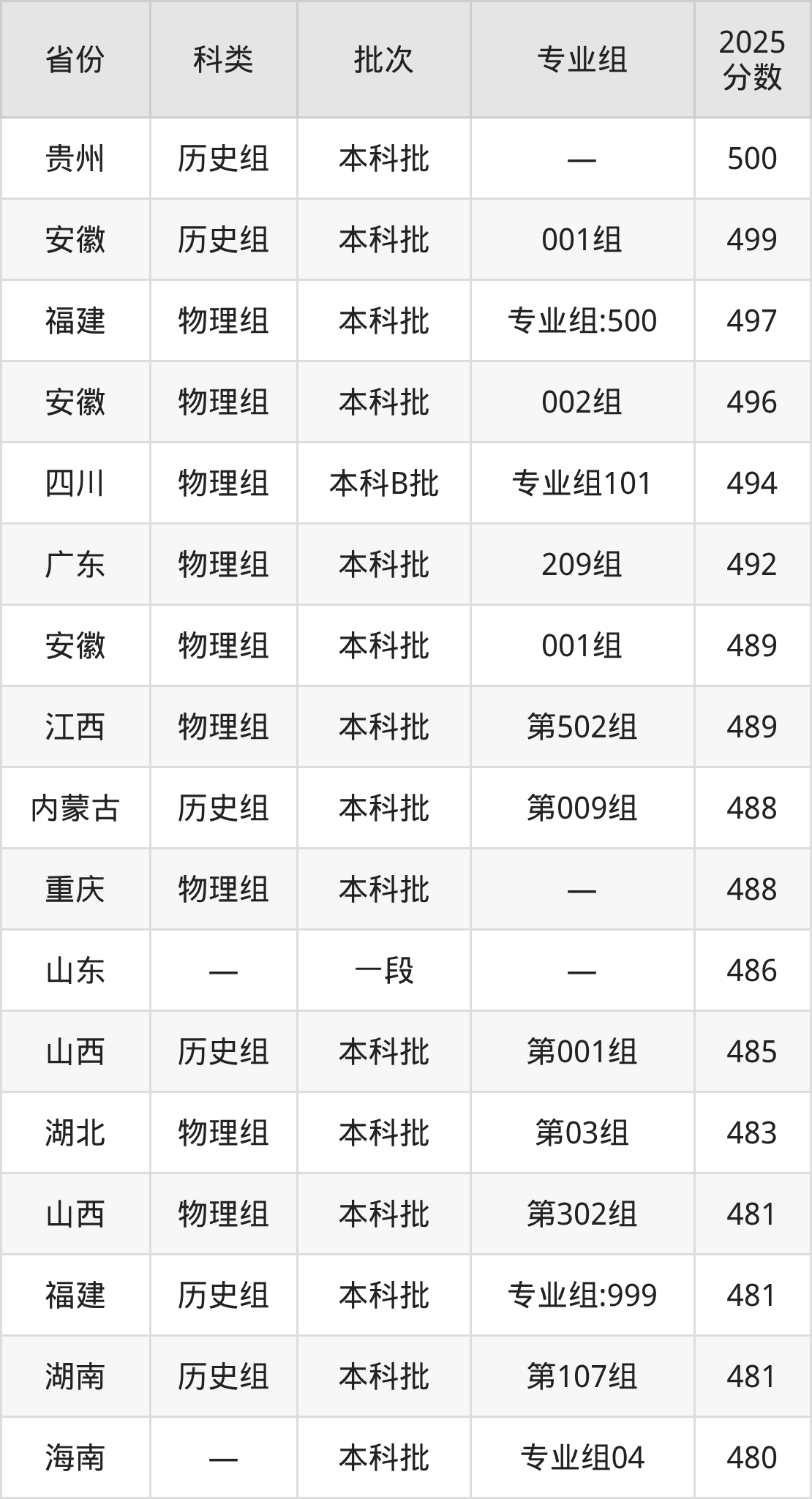 2025年山西传媒学院在全国普通批次招生的录取分数范围位于402~556分之间,其中省内分数范围为455分~485分,物理组最低分专业组为“第301组”,考生455分即可报考,历史组最低分专业组为“第001组”,考生485分即可报考。