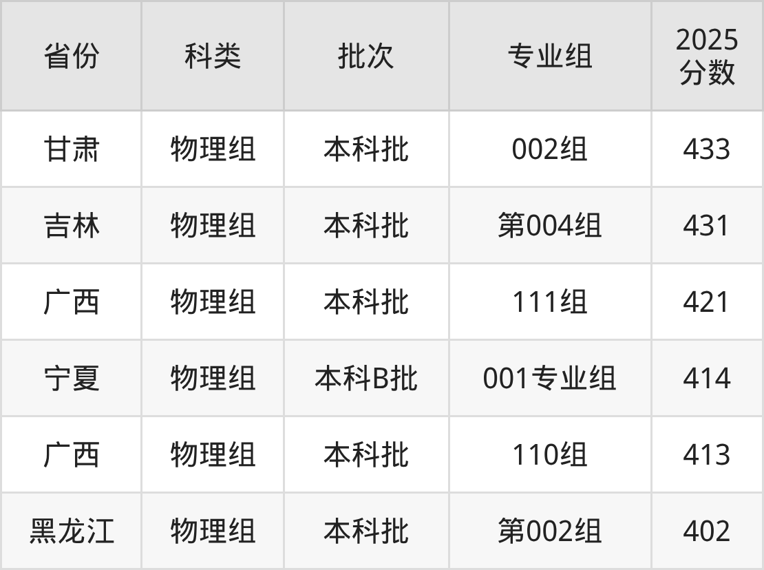 山西传媒学院在省外招生的最低分为402分,其中黑龙江地区物理组考生上山西传媒学院的分数门槛最低,考生成绩超本科线42分(402分)可上。其次是广西物理组考生,上山西传媒学院至少要超本科线43分(413分)。