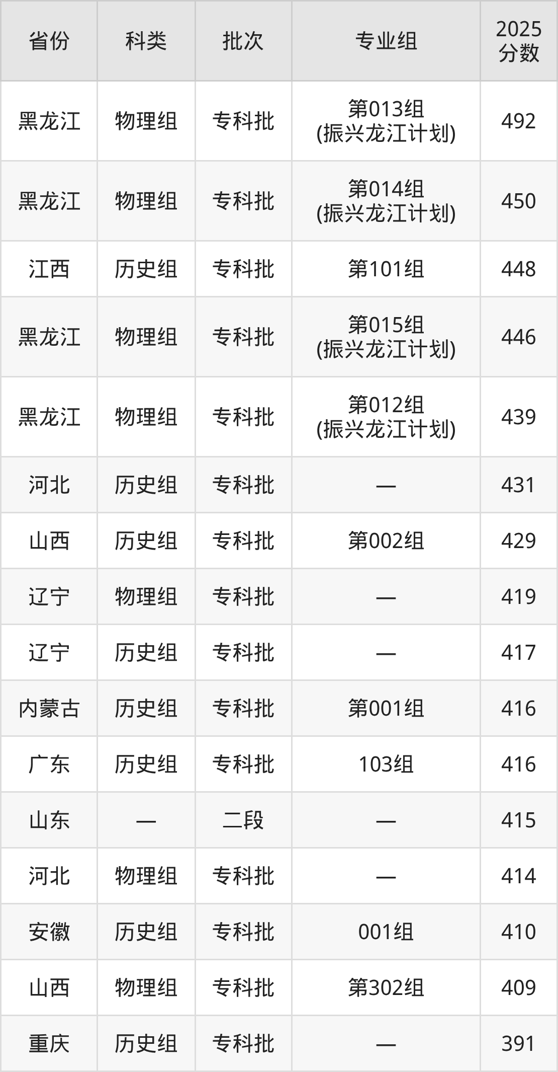 而江西地区历史组考生的分数门槛最高,2025年黑龙江护理高等专科学校第101组在江西招生最低分为448分,考生至少要超专科线158分才有可能被录取。