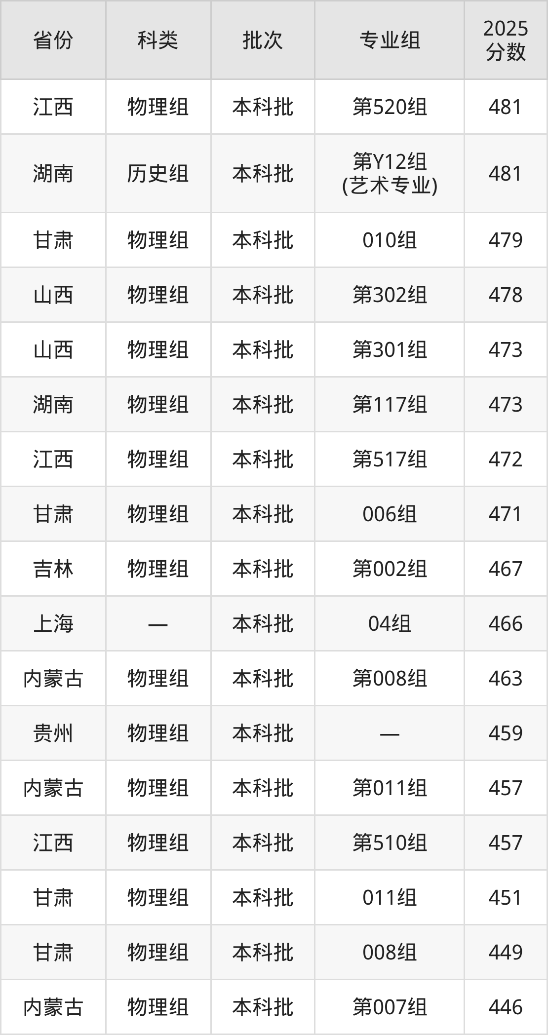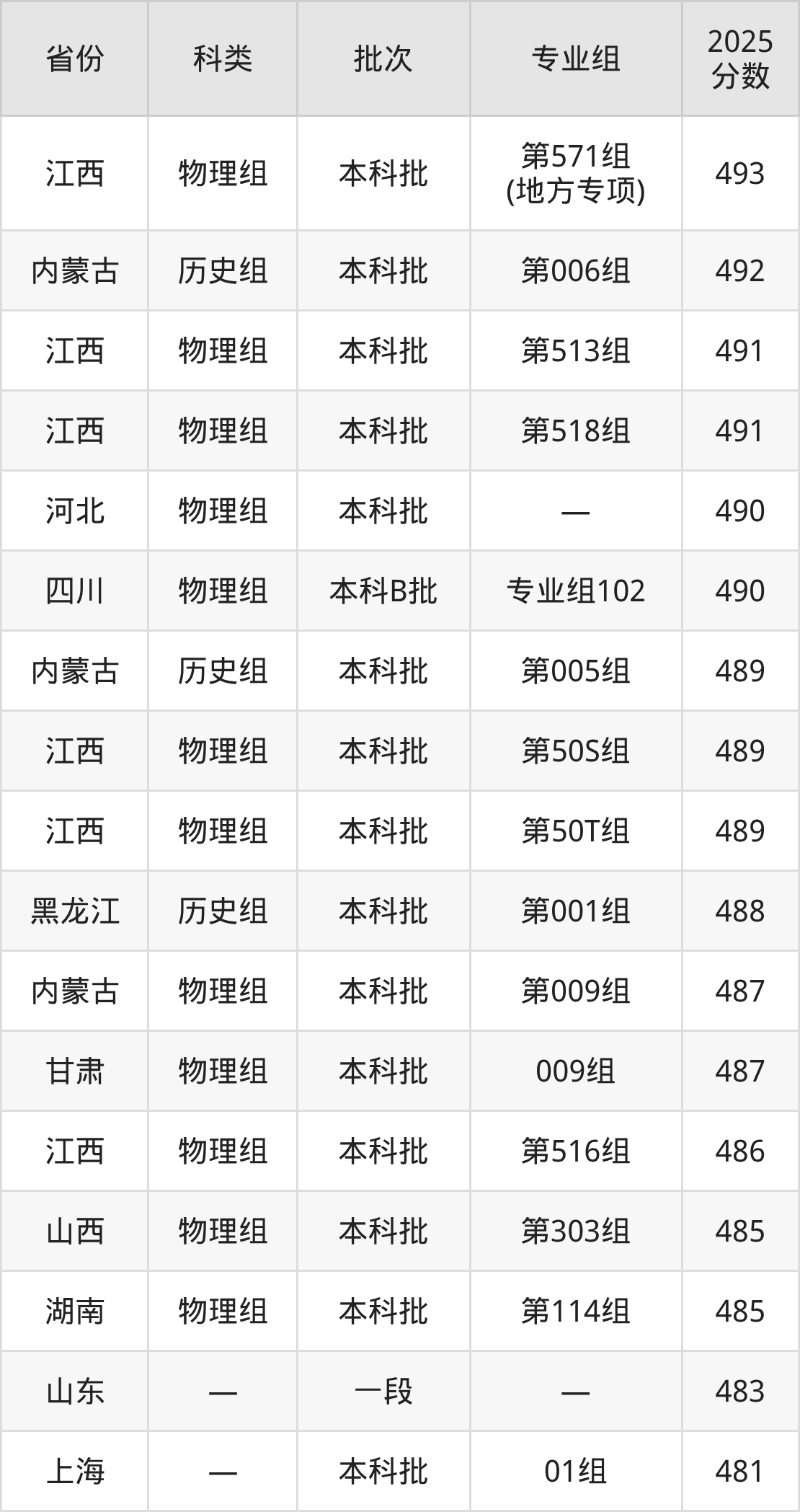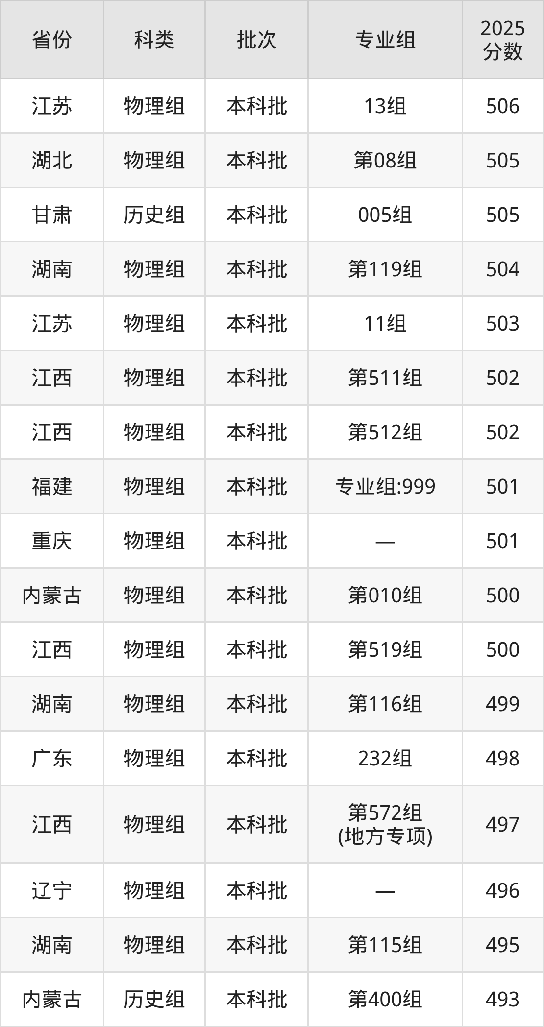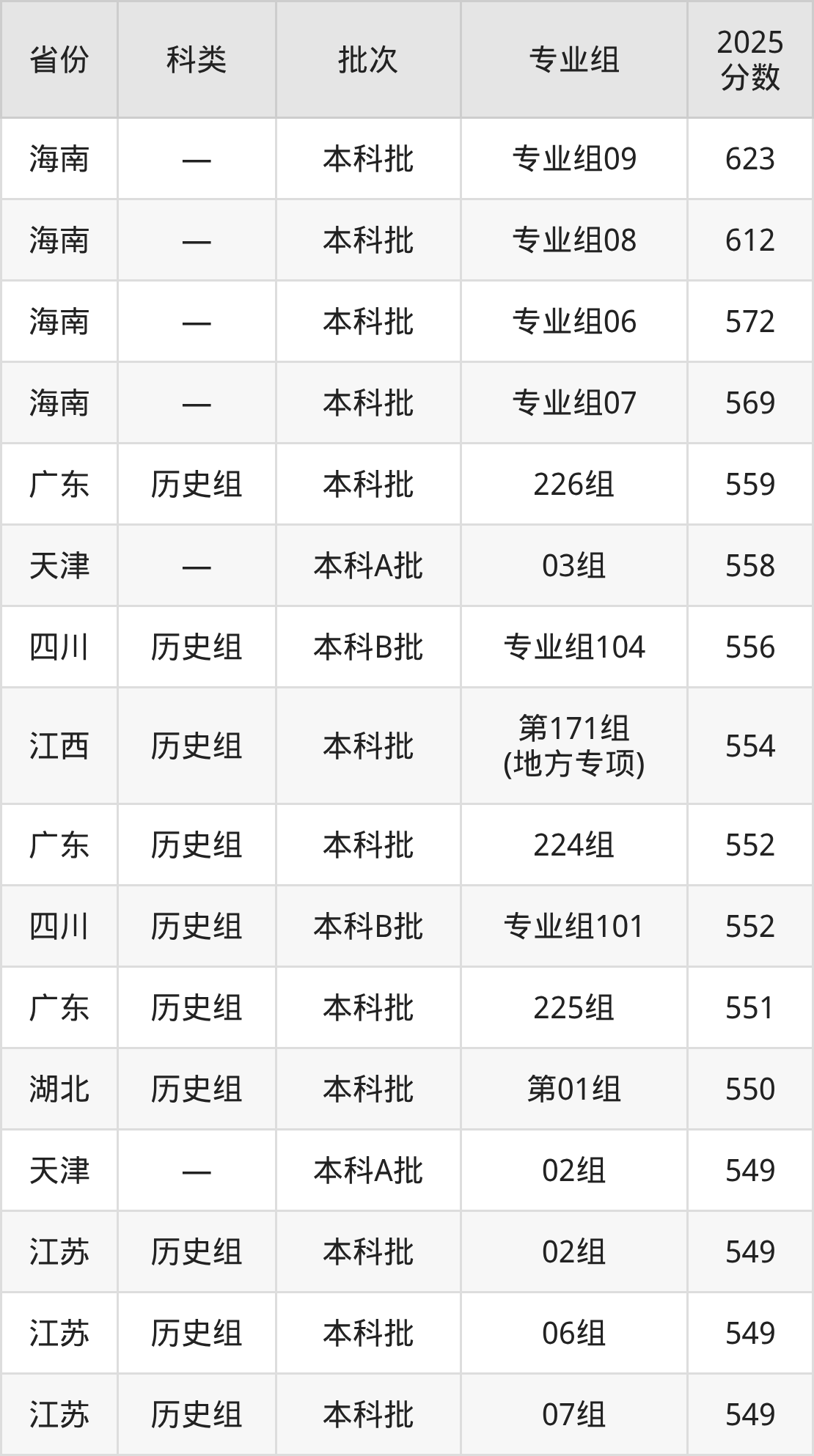 2025年赣南师范大学在全国普通批次招生的录取分数范围位于409~623分之间,其中省内分数范围为457分~554分,历史组最低分专业组为“第10C组”,考生517分即可报考,物理组最低分专业组为“第510组”,考生457分即可报考。