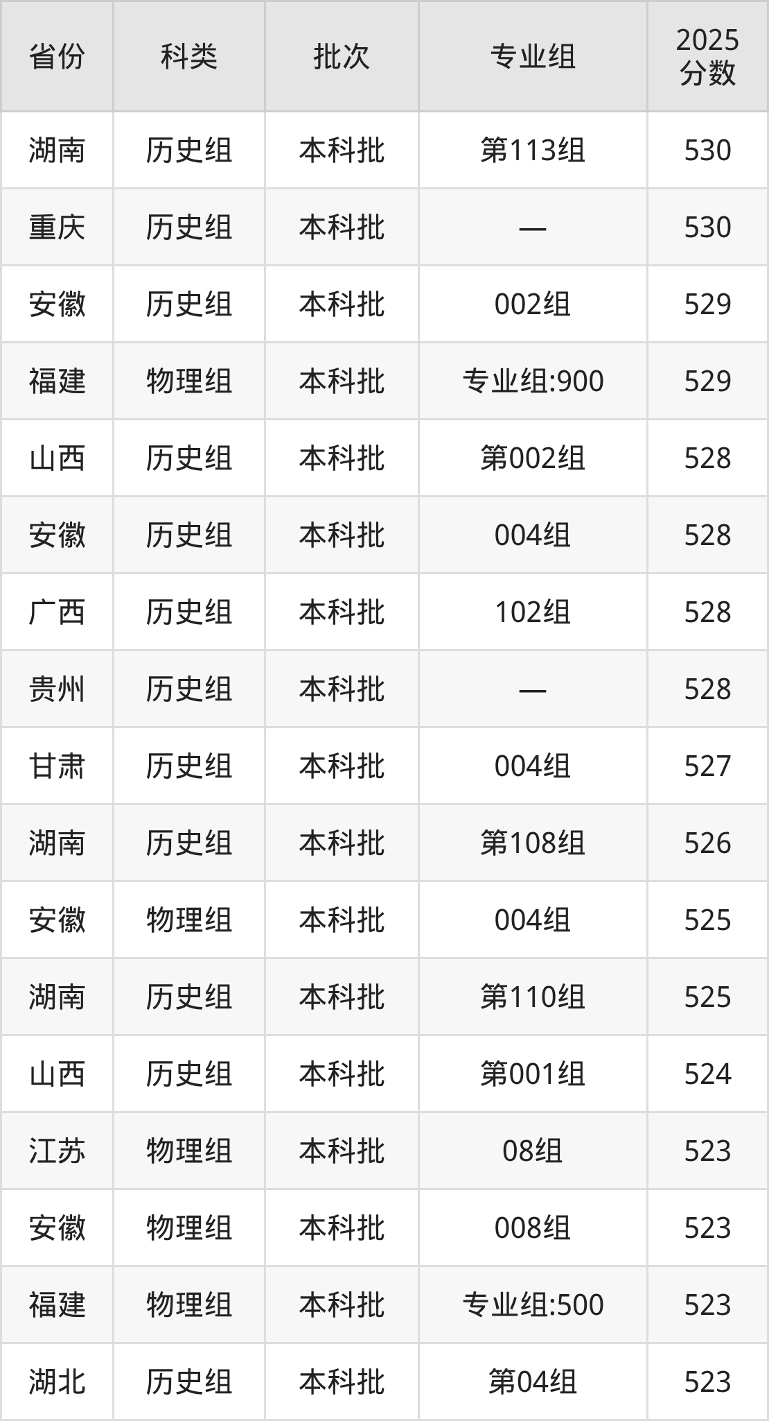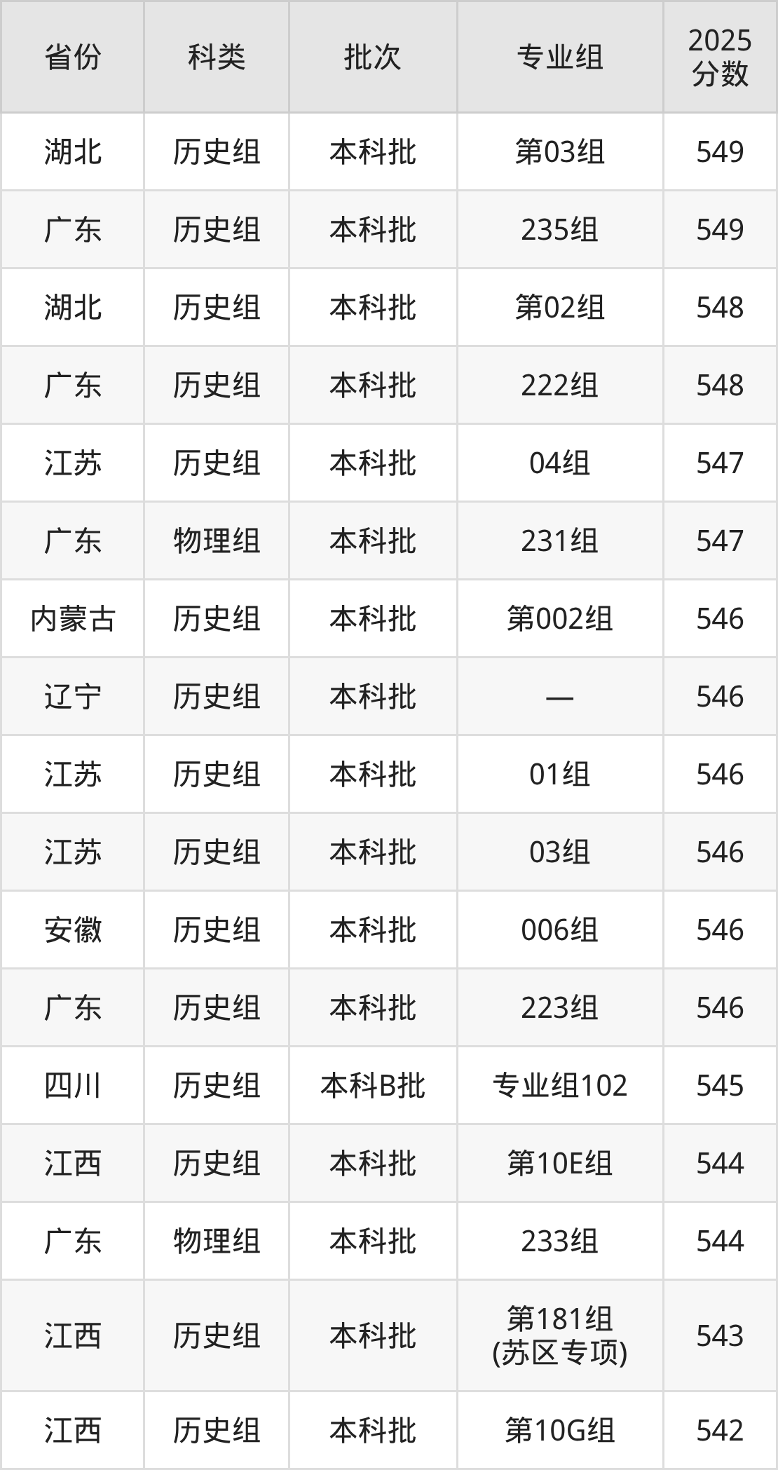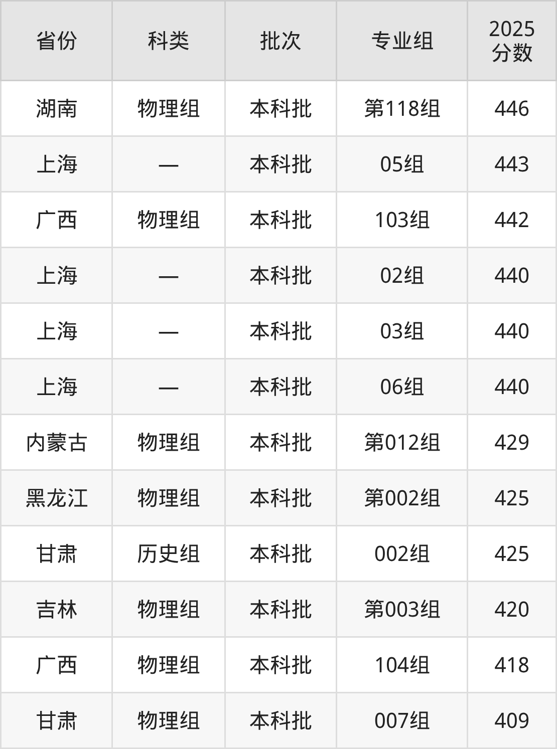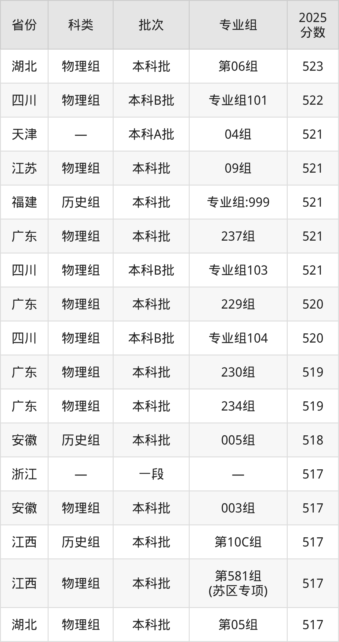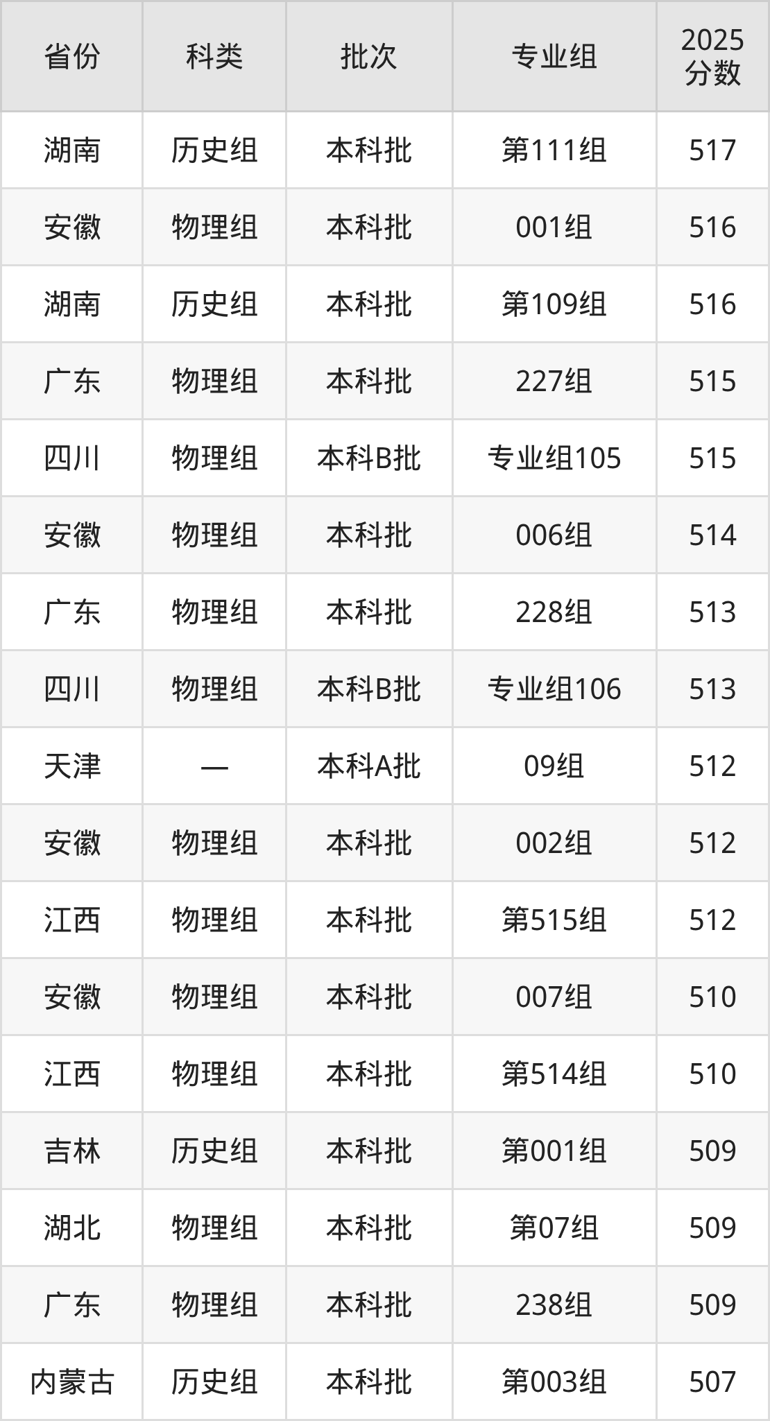 2025年赣南师范大学在全国普通批次招生的录取分数范围位于409~623分之间,其中省内分数范围为457分~554分,历史组最低分专业组为“第10C组”,考生517分即可报考,物理组最低分专业组为“第510组”,考生457分即可报考。