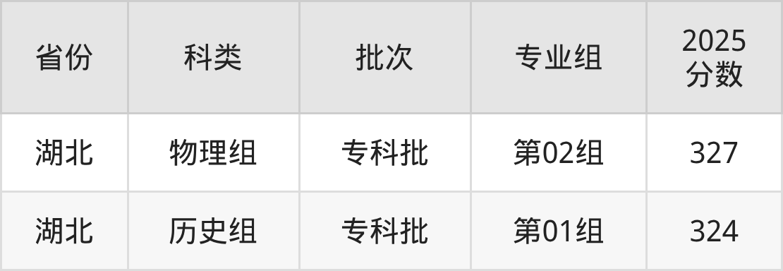 2025年武汉工贸职业学院在全国普通批次招生的录取分数范围位于324~327分之间,其中省内分数范围为324分~327分,物理组最低分专业组为“第02组”,考生327分即可报考,历史组最低分专业组为“第01组”,考生324分即可报考。