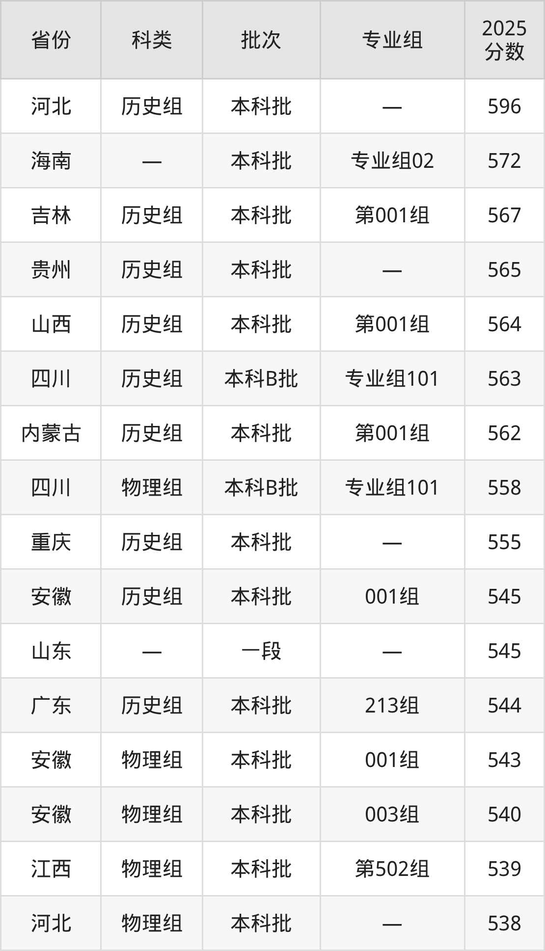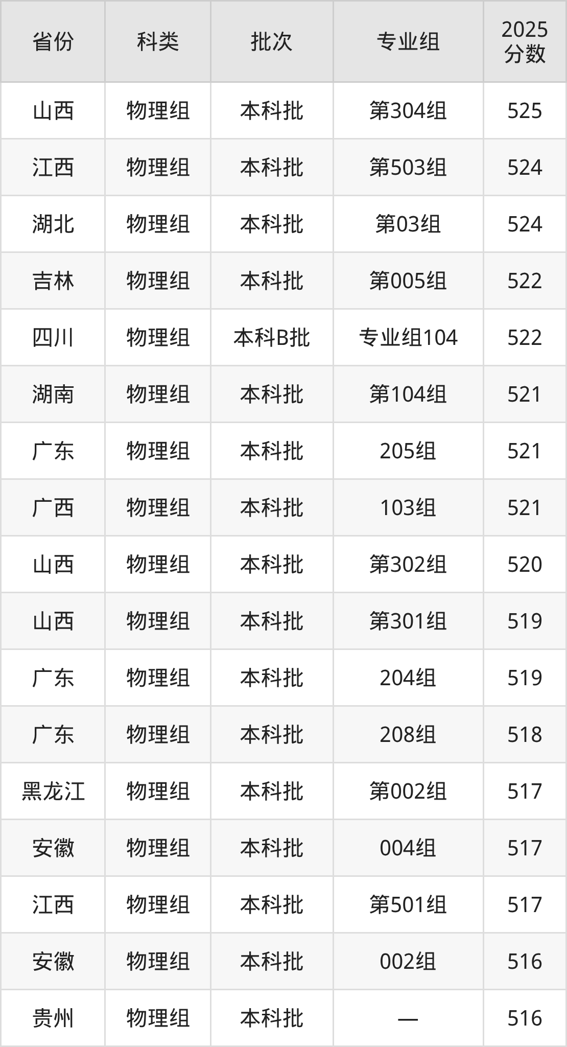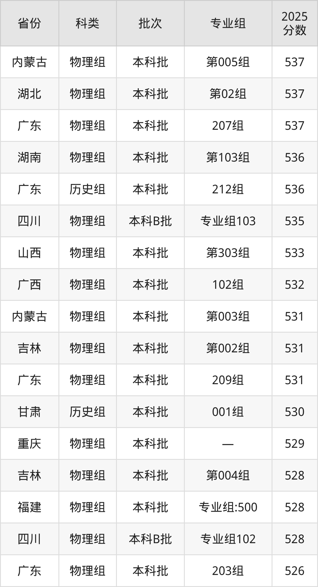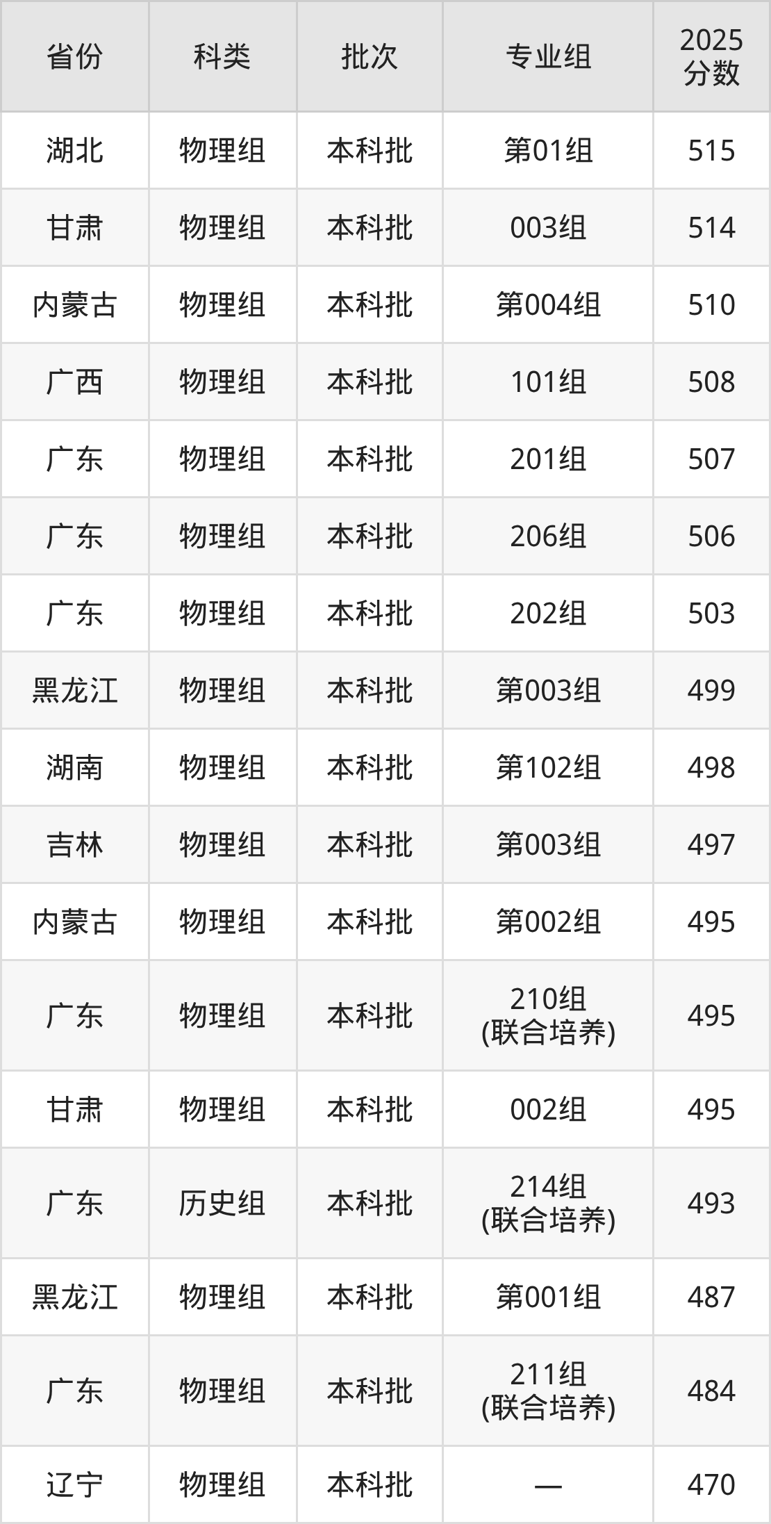 2025年五邑大学在全国普通批次招生的录取分数范围位于470~596分之间,其中省内分数范围为484分~544分,物理组最低分专业组为“211组(联合培养)”,考生484分即可报考,历史组最低分专业组为“214组(联合培养)”,考生493分即可报考。