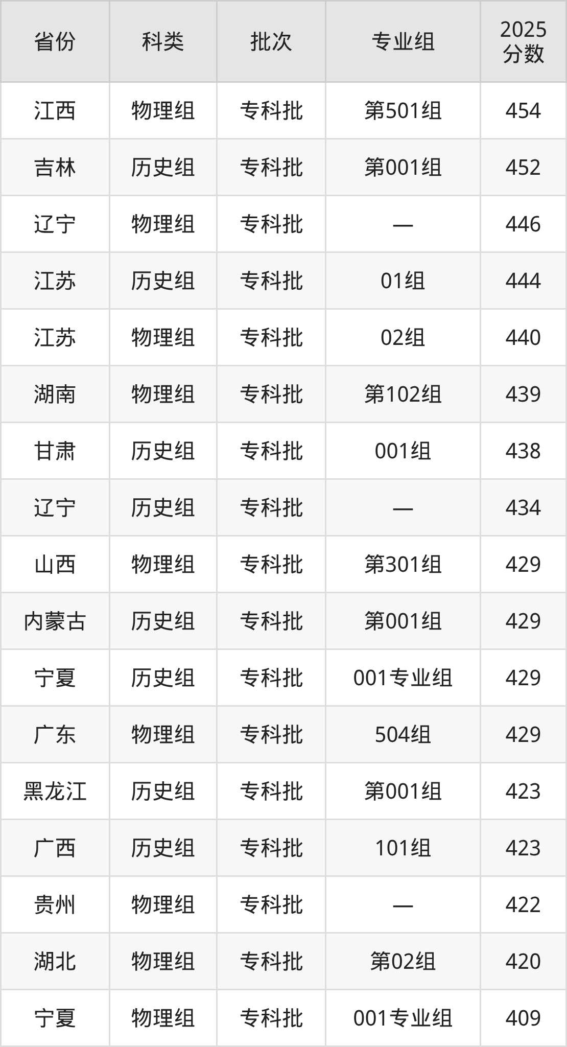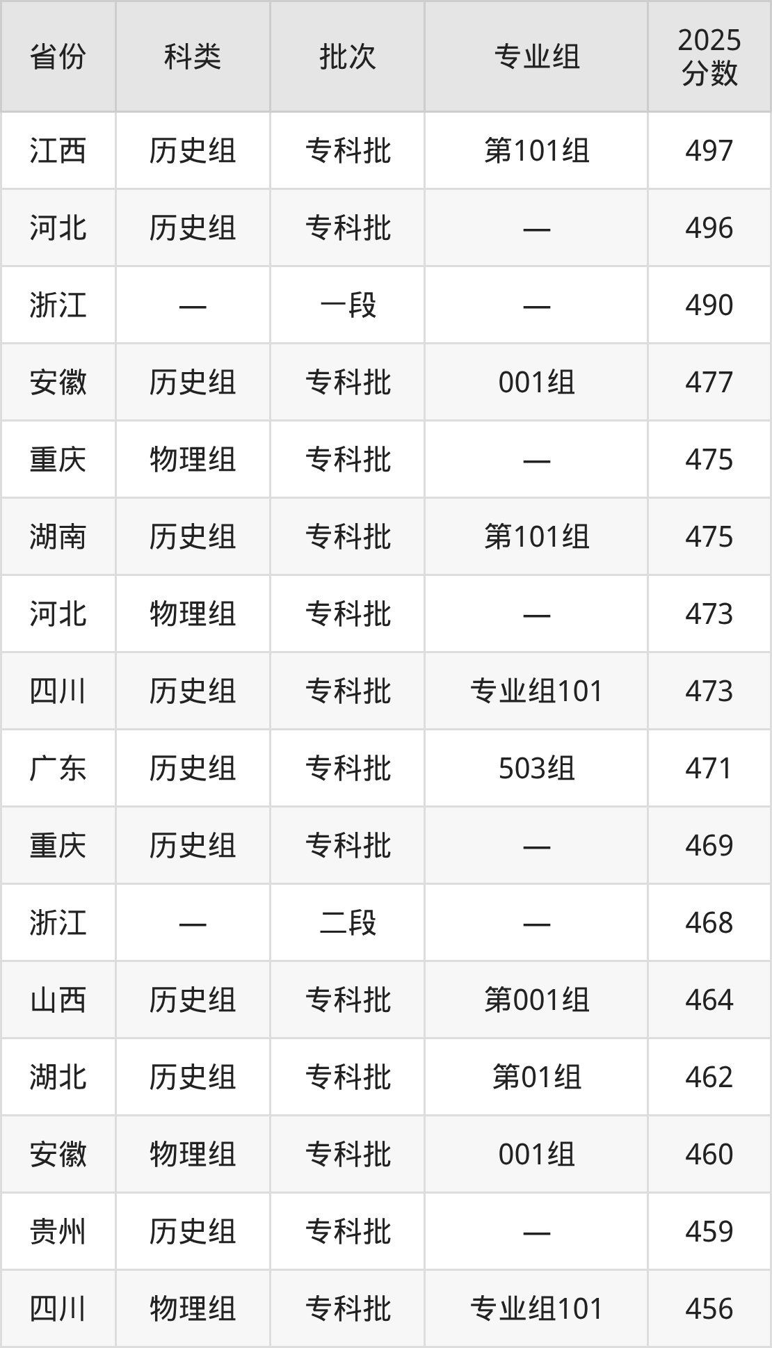 而江西地区历史组考生的分数门槛最高,2025年天津市职业大学第101组在江西招生最低分为497分,考生至少要超专科线207分才有可能被录取。