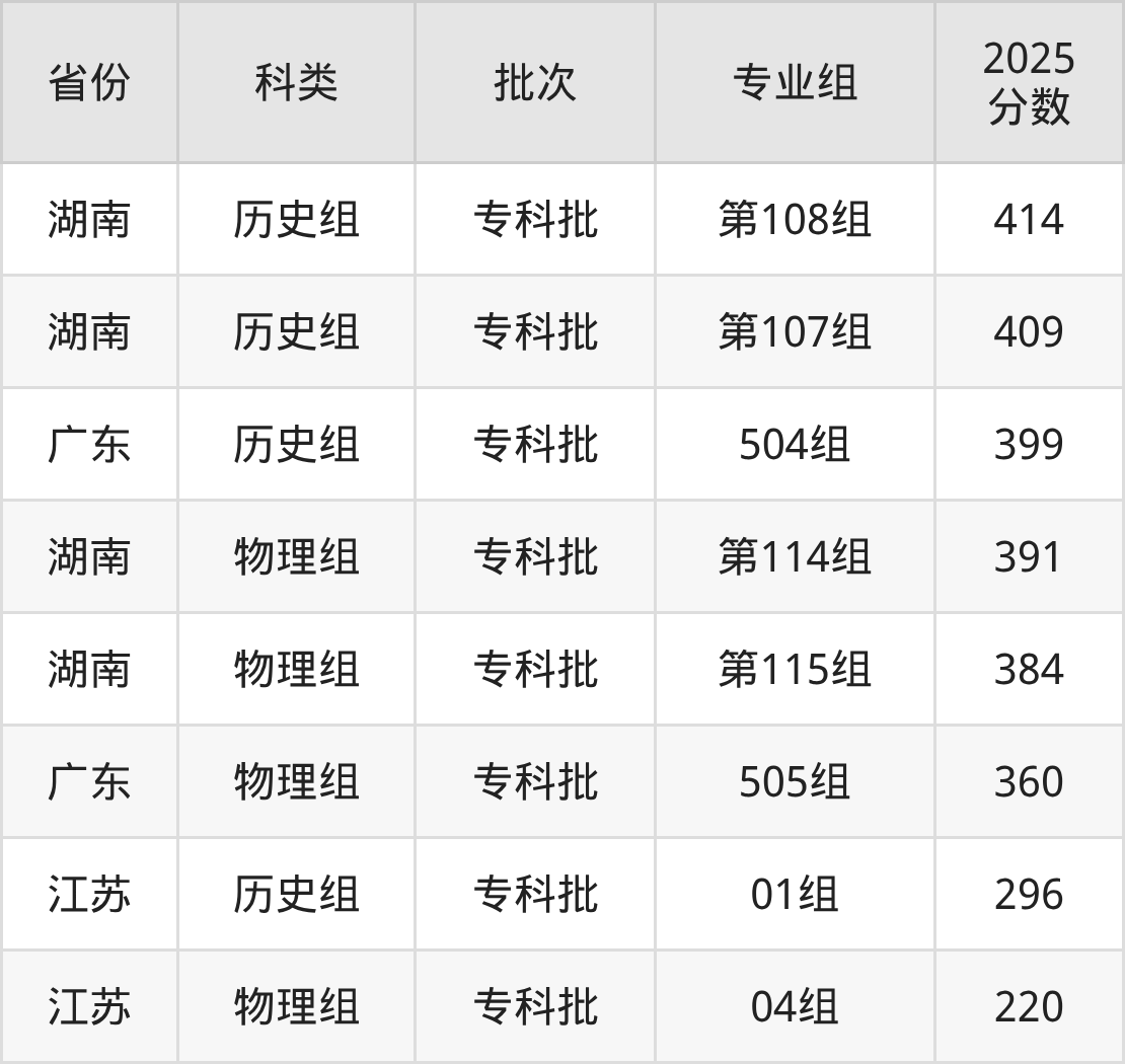 而广东地区历史组考生的分数门槛最高,2025年湖南体育职业学院504组在广东招生最低分为399分,考生至少要超专科线184分才有可能被录取。
