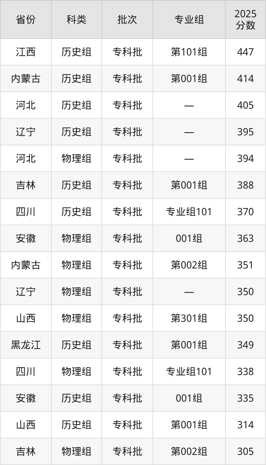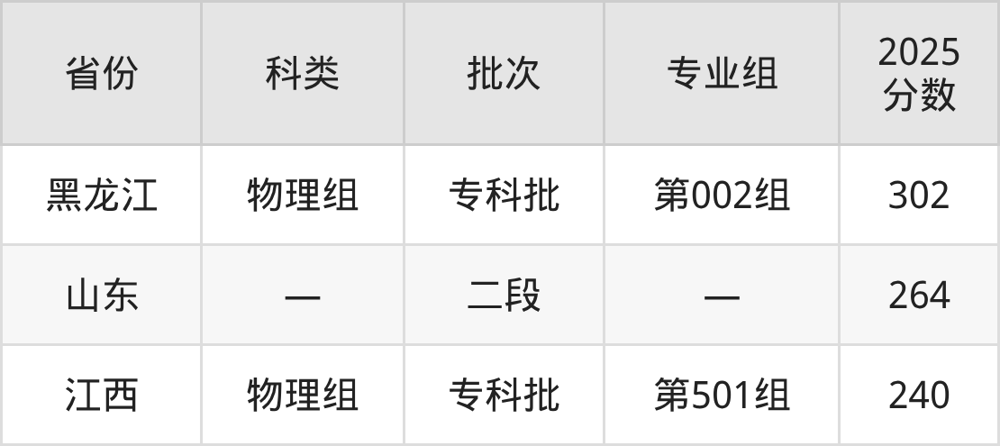 山东商务职业学院在省外招生的最低分为240分,其中江西地区物理组考生上山东商务职业学院的分数门槛最低,考生成绩达专科线即可报考。其次是黑龙江物理组考生,上山东商务职业学院至少要超专科线142分(302分)。