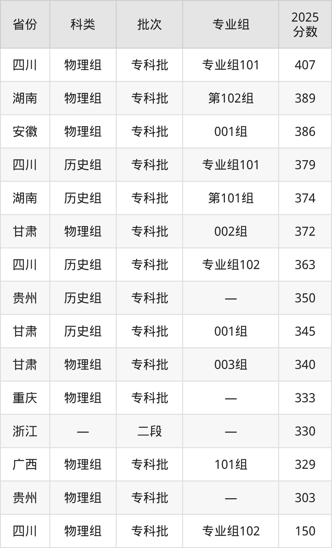 下面是昆明工业职业技术学院2025年在全国各省的录取分数线一览表,供参考: