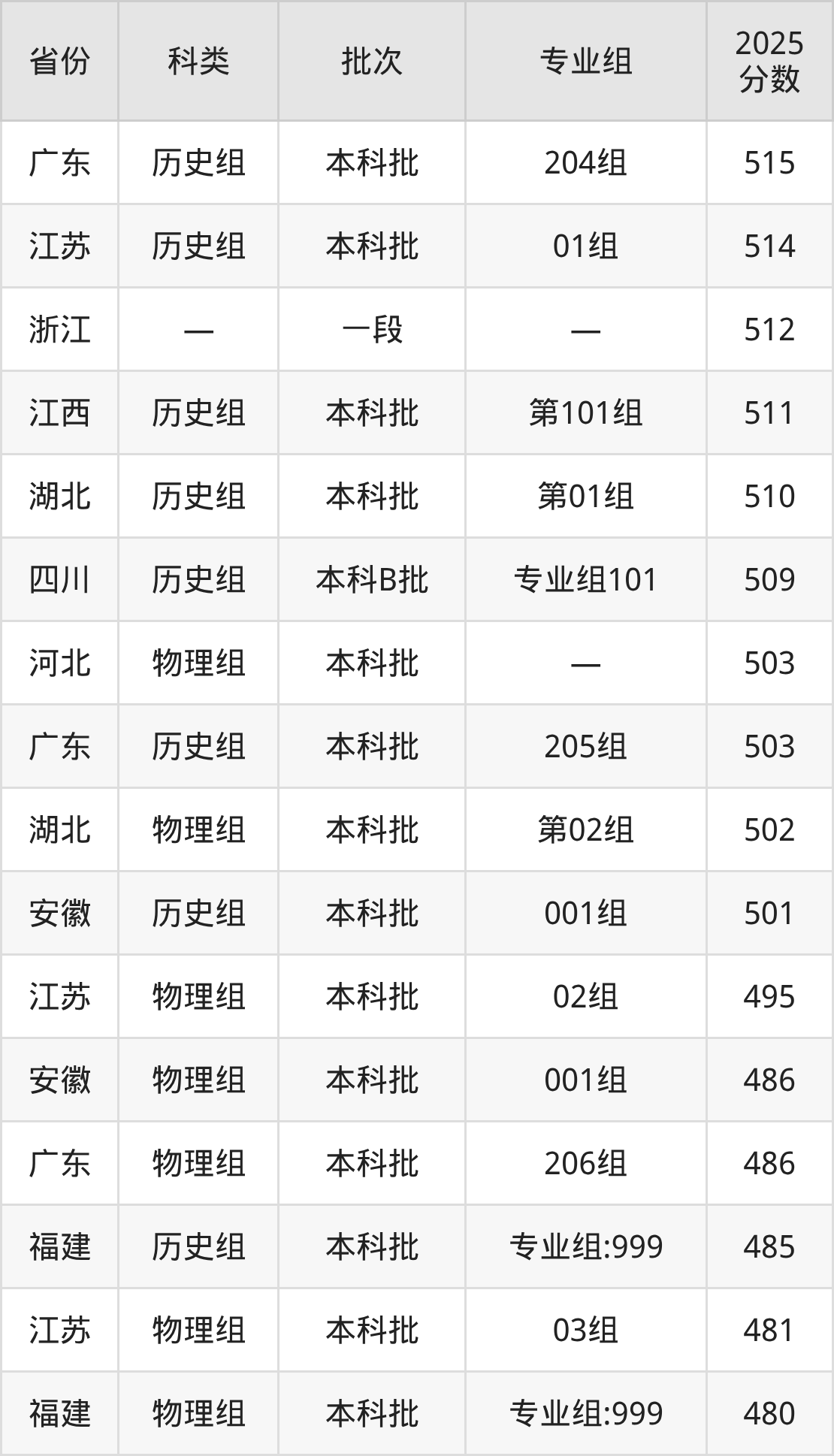 而广东地区历史组考生的分数门槛最高,2025年浙江工业大学之江学院204组在广东招生最低分为515分,考生至少要超本科线51分才有可能被录取。