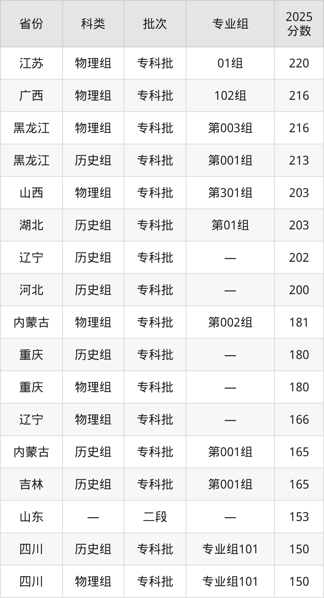 2025年四川国际标榜职业学院在全国普通批次招生的录取分数范围位于150~345分之间,其中省内分数在150分,历史组最低分专业组为“专业组101”,考生150分即可报考,物理组最低分专业组为“专业组101”,考生150分即可报考。