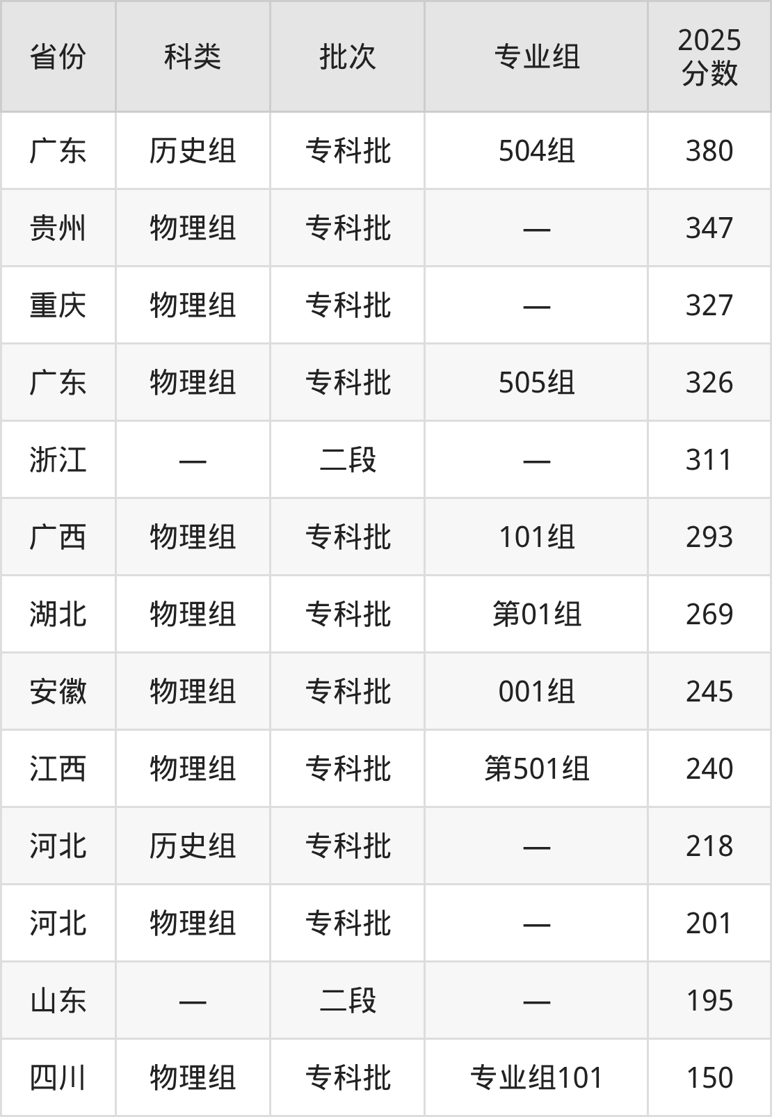 而广东地区历史组考生的分数门槛最高,2025年厦门兴才职业技术学院504组在广东招生最低分为380分,考生至少要超专科线165分才有可能被录取。